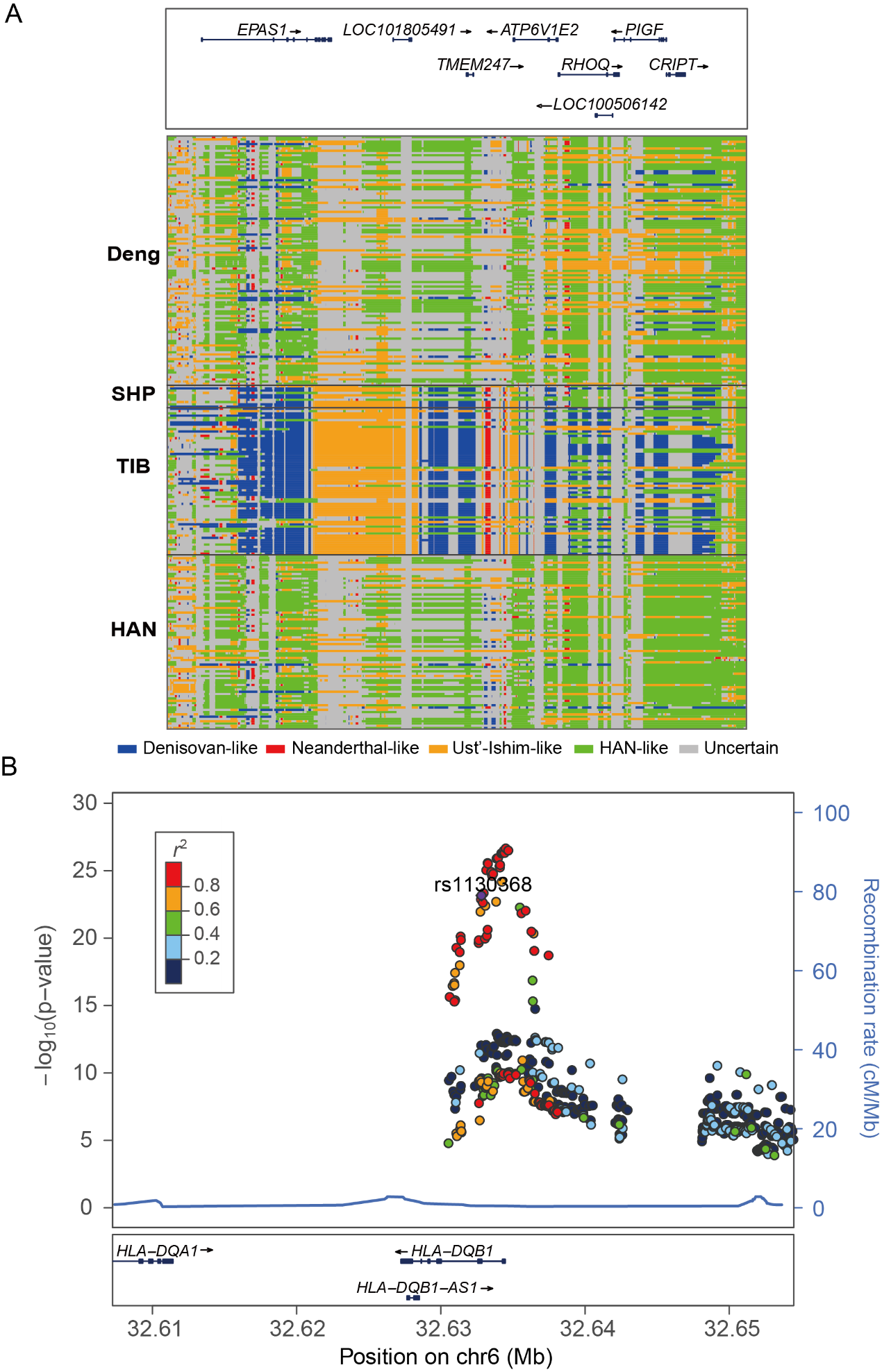 A. EPAS1基因区域的古人基因组序列分布图