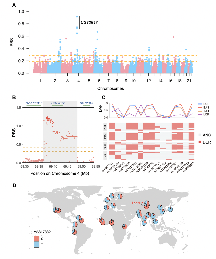 通过自然选择分析,研究揭示:(1)UGT2B17基因家族多样性可能与罗布人沙漠环境适应相关,其功能涉及毒素代谢与能量平衡调控;(2)长期高盐、高脂饮食可能对脂质代谢通路施加强烈选择压力(图4)。