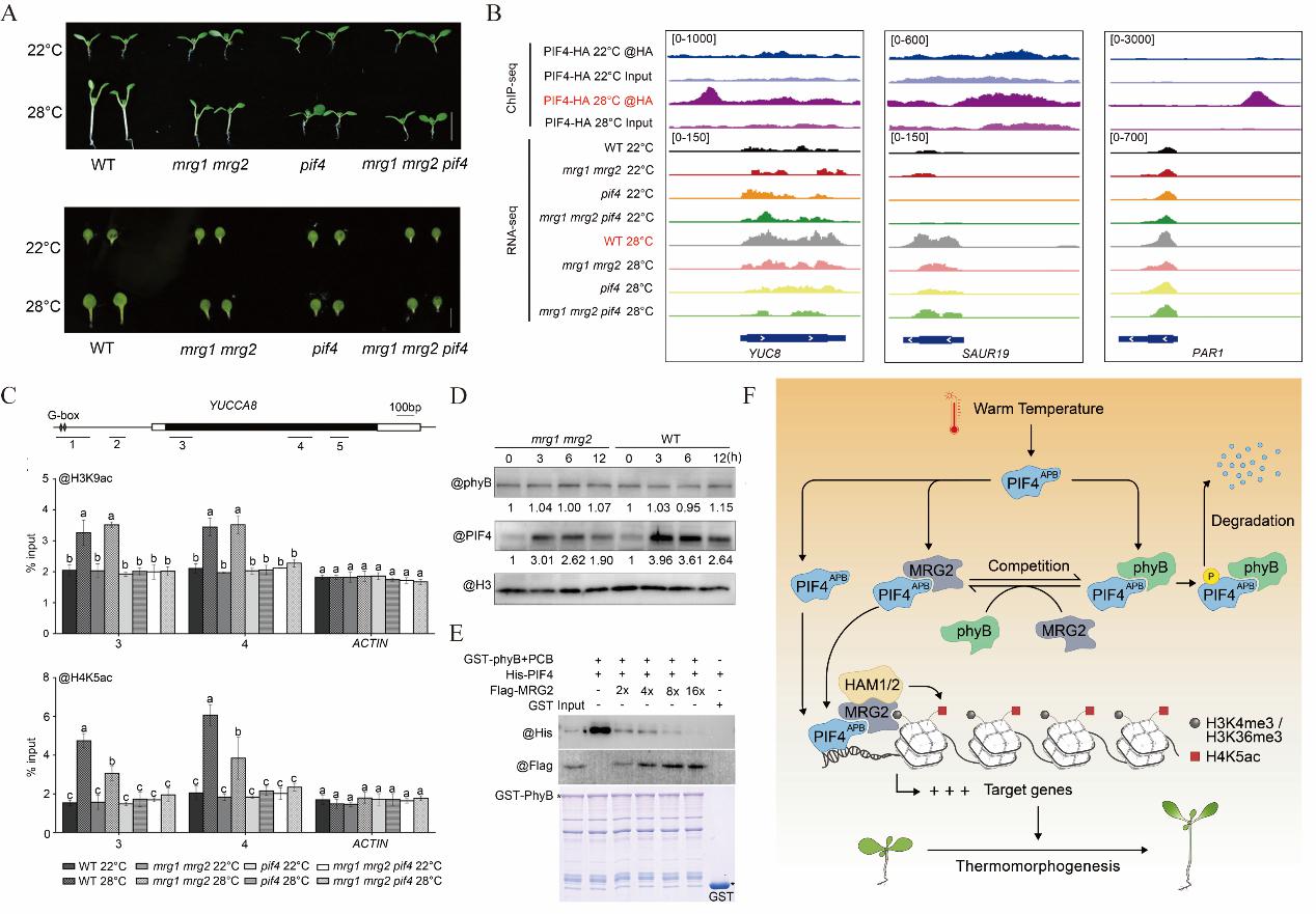 A.28℃条件下,mrg1 mrg2表现出与pif4突变体类似的热形态建成缺陷;B. ChIP-seq及RNA-seq结果显示PIF4-MRG2共同调控靶基因;C. PIF4-MRG2促进靶基因上H4K5ac的建立;D. mrg1 mrg2突变体中PIF4蛋白减少;E. MRG2与phyB竞争结合PIF4;F. PIF4-MRG2共同参与植物高温响应的模式图。