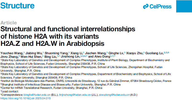 2025年5月12日,贝博体育官网 董爱武团队于Structure杂志在线发表题为“Structural and functional interrelationships of histone H2A with its variants H2A.Z and H2A.W in Arabidopsis”的研究论文,揭示了拟南芥组蛋白H2A与其变体H2A.Z、H2A.W的结构与功能关系。