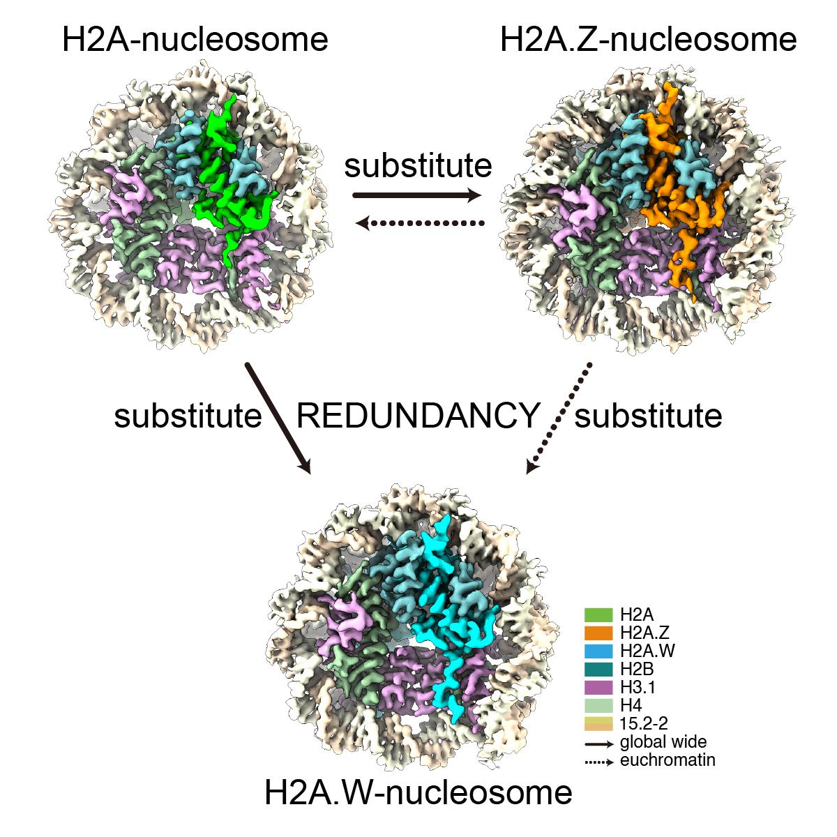 利用拟南芥来源的天然DNA和重组组蛋白及变体,本研究成功构建了包含H2A、H2A.Z或H2A.W的单核小体,并通过冷冻电镜单颗粒技术解析了其近原子分辨率的三维结构。含H2A.Z的植物核小体DNA末端刚性介于含H2A或H2A.W的核小体之间。相比之下,动物H2A.Z核小体DNA入口端和出口端的刚性低于H2A核小体,这可能源于动植物H2A.Z尾部结构的差异。植物H2A.Z核小体刚性的中间态特性与其在常染色质及兼性染色质区域的分布模式相契合,支持其对植物基因转录的双重调控作用。鉴于H2A.Z参与多种胁迫响应过程,其核小体的中间态可能有助于植物适应环境变化。综合研究结果表明,拟南芥中H2A及其变体在结构上具有高度相似性,在功能上存在冗余性。