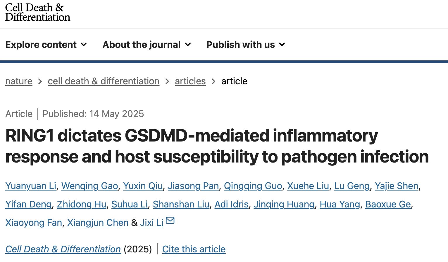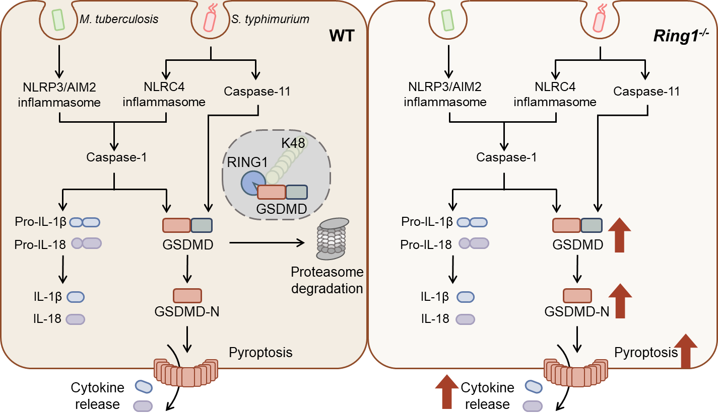 细胞焦亡(pyroptosis)是机体应对病原体感染的重要炎症性死亡方式,但其过度激活可能导致败血症等致命性炎症损伤。RING1作为多梳抑制复合物PRC1的核心组分,在表观遗传调控中发挥关键作用,但在炎症与感染中的功能尚不明确。2025年5月14日,复旦大学李继喜教授团队在《Cell Death & Differentiation 》杂志发表了题为“RING1 dictates GSDMD-mediated inflammatory response and host susceptibility to pathogen infection”的研究论文。该研究首次揭示RING1通过泛素化降解焦亡关键蛋白GSDMD,调控宿主对病原体感染的炎症反应。