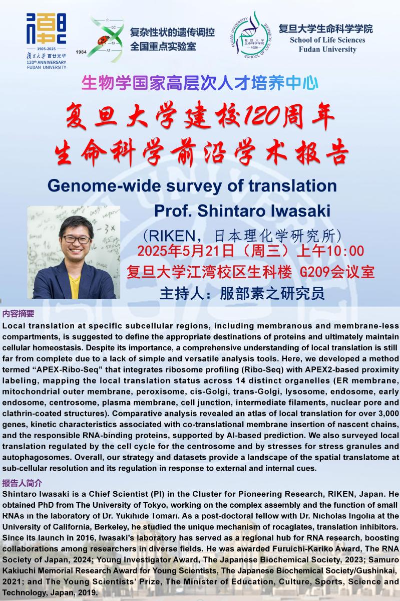 生命科学前沿学术报告-2025年5月21日(周三)上午10:00,Shintaro lwasaki (RIKEN,日本理化学研究所)
