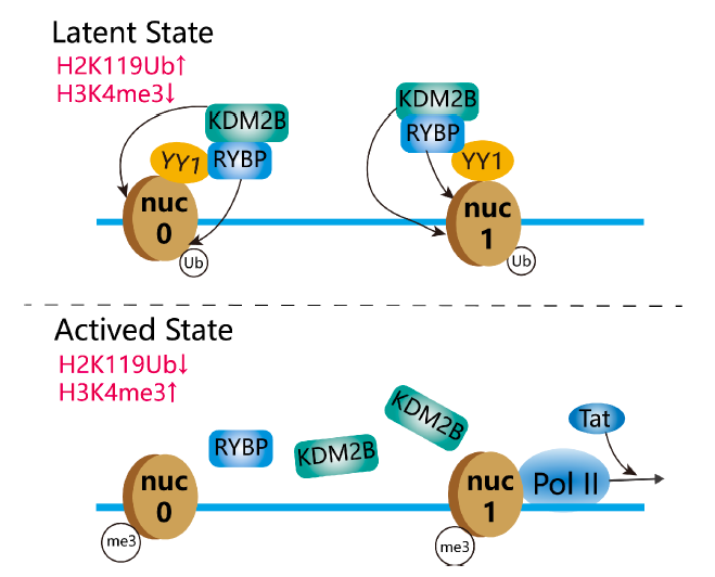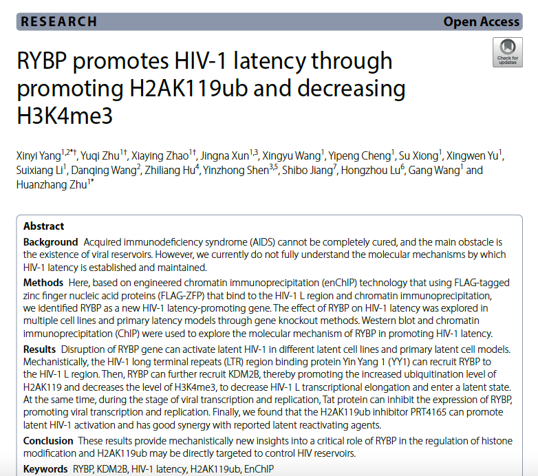 为了解决上述科学问题,近日,贝博体育官网 朱焕章课题组与复旦大学义乌研究院杨辛毅课题组合作,在《Cell Communications and Signaling》杂志(JCR Q1,IF=8.4)上发表了题为“RYBP promotes HIV-1 latency through promoting H2AK119ub and decreasing H3K4me3”的研究长文。在本论文中,研究团队鉴定了多梳蛋白抑制复合物1(PRC1)亚基RYBP是新的HIV-1潜伏调控基因,且RYBP主要通过调控组蛋白H2AK119泛素化,以及招募组蛋白去甲基化酶KDM2B至HIV-1基因组的LTR区来促使组蛋白H3K4me3去甲基化修饰,从而促进HIV-1潜伏病毒的形成和维持。该研究不仅拓展了我们对HIV-1潜伏调控机制的理解,也为潜伏病毒库的清除提供了潜在的新靶点,提示RYBP可能成为HIV-1潜伏逆转策略中的重要干预因子。