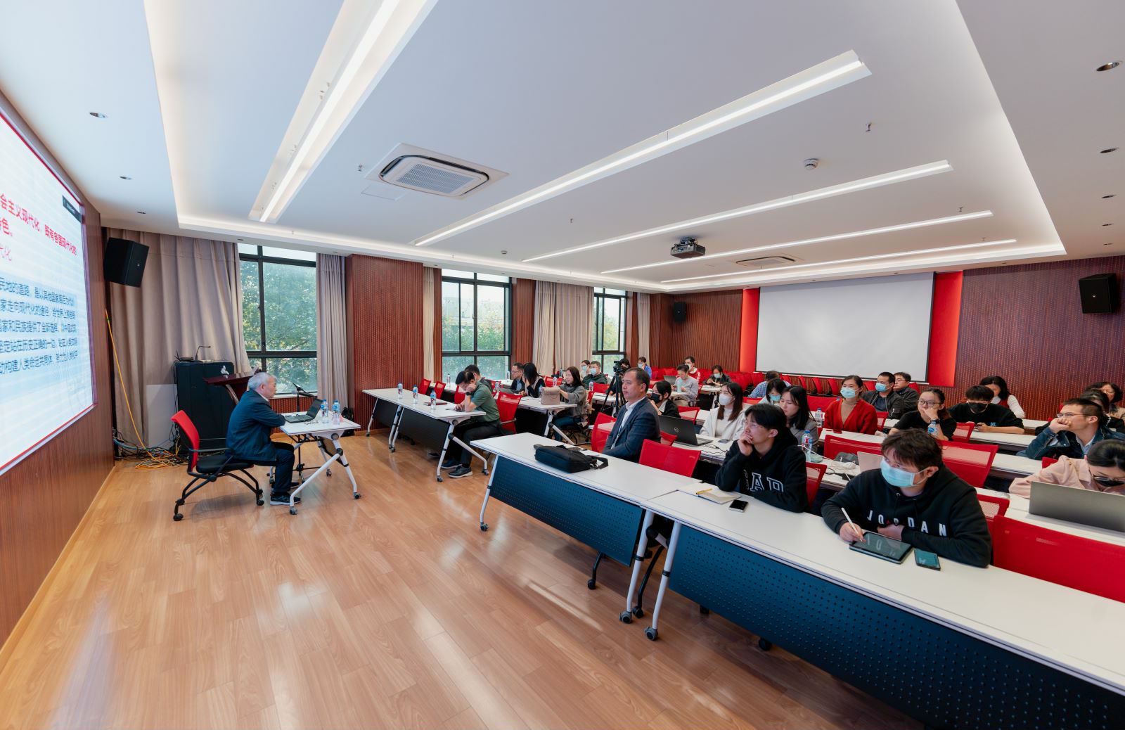 接下来,张卫教授以二十大报告中“3件大事+16个方面的历史性成就和历史性变革+4个方面的里程碑意义”的脉络带领师生学习了新时代十年的伟大变革及其里程碑意义。关于“开辟马克思主义中国化时代化”需要做到的“两个结合”与“六个必须坚持”,张卫教授也为师生们作了解读。“两个结合”是指坚持和发展马克思主义,必须同中国具体实际相结合,必须同中华优秀传统文化相结合。“六个必须坚持”则是必须坚持人民至上、必须坚持自信自立、必须坚持守正创新、必须坚持问题导向、必须坚持系统观念、必须坚持胸怀天下。关于新时代新征程中国共产党的使命任务,张卫教授带领师生学习了中国式现代化,包括五大特点、本质要求和五个坚持等内容。