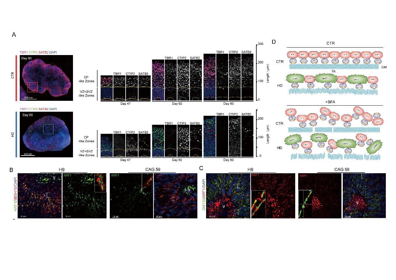 该研究首先利用HD患者多能干细胞衍生的皮层类器官(hCO)模拟了HD胎儿大脑皮质的改变,包括神经管中的连接复合体缺陷、有丝分裂后神经元成熟延迟、皮质神经元亚型的命运规范失调以及皮质发生过程中早期HD皮质下投射的异常。上述病理表型与HD胚胎样本病理表型高度吻合,也提示了HD大脑中受损的神经前体细胞与混乱的皮质神经元分层之间可能的因果联系。为了进一步研究HD皮层发育受损的潜在机制,他们研究人员将目光转向hCO神经前体细胞区域(神经管样区域)中,发现了这个区域polyQ组装体的富集具有一定的方向性,并可引导高尔基体结构并分拣clathrin+囊泡。他们进一步推测高尔基体结构通过 ADP 核糖基化因子 1(ARF1)连接 polyQ 组装体,并使用Brefeldin A (BFA)对于ARF1活化的抑制证明了这一点,BFA的干预可使高尔基体中与 polyQ 组装体解离。与正常的hCOs相比,在HD-hCOs的神经管样区域中,带有mHTT的polyQ组装体上的ARF1更少, 同时表现出更短的polyQ组装体以及更短高尔基体结构。因此内源性mHTT所参与的polyQ组装可能降低了神经上皮细胞中高尔基体招募ARF1的能力,损害了高尔基体的结构和活性,是HD-hCO皮质发育异常的潜在机制。