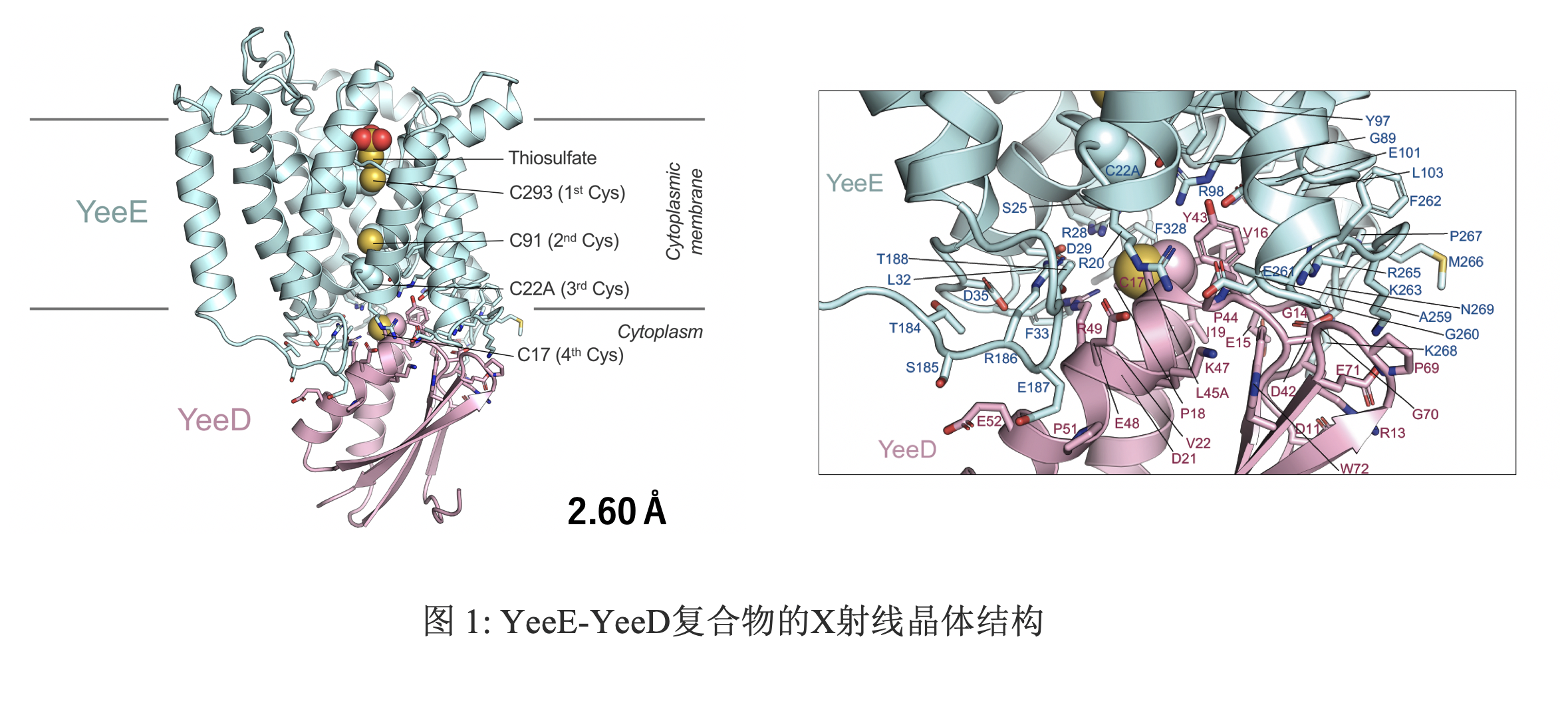 L-半胱氨酸、L-蛋氨酸、硫胺素、谷胱甘肽、生物素和铁硫(FeS)簇等生物大分子都含有硫原子。因此,从环境中吸收硫代硫酸根离子作为无机硫源是细菌的一个重要过程。最近,一种膜蛋白YeeE被鉴定为细菌新型硫代硫酸吸收途径的一个组成部分。然而,YeeE对硫代硫酸根离子的吸收活性并未在体外进行测量。此外,YeeE的伴侣蛋白也没有被确定。在此,我们直接测定了纯化的YeeE蛋白的硫代硫酸吸收活性。接着,通过生长互补试验,我们发现YeeD是YeeE在细菌生长过程中的重要伙伴。通过质谱分析,纯化的YeeD蛋白出现了多种与硫有关的修饰。在硫代硫酸根离子存在的情况下,检测到YeeD蛋白中相当于硫代硫酸的质量增加,这表明硫代硫酸根离子可直接与YeeD蛋白结合。通过化学分析,还发现 YeeD蛋白具有分解硫代硫酸盐的活性。利用YeeE和YeeD的融合蛋白,解析了 YeeE-YeeD蛋白2.60 Å的X射线晶体结构(图 1)。利用丙氨酸突变的YeeD蛋白证实了晶体包中参与YeeE和YeeD相互作用的氨基酸残基。此外,在硫代硫酸存在的情况下,YeeD与YeeE的亲和力明显降低。在我们的分子动力学模拟中,硫代磺酸化的YeeD与YeeE分离。基于这些结果,我们揭示了YeeE和YeeD合作的重要性,并提出了YeeE/YeeD硫代硫酸根离子转运的模型。