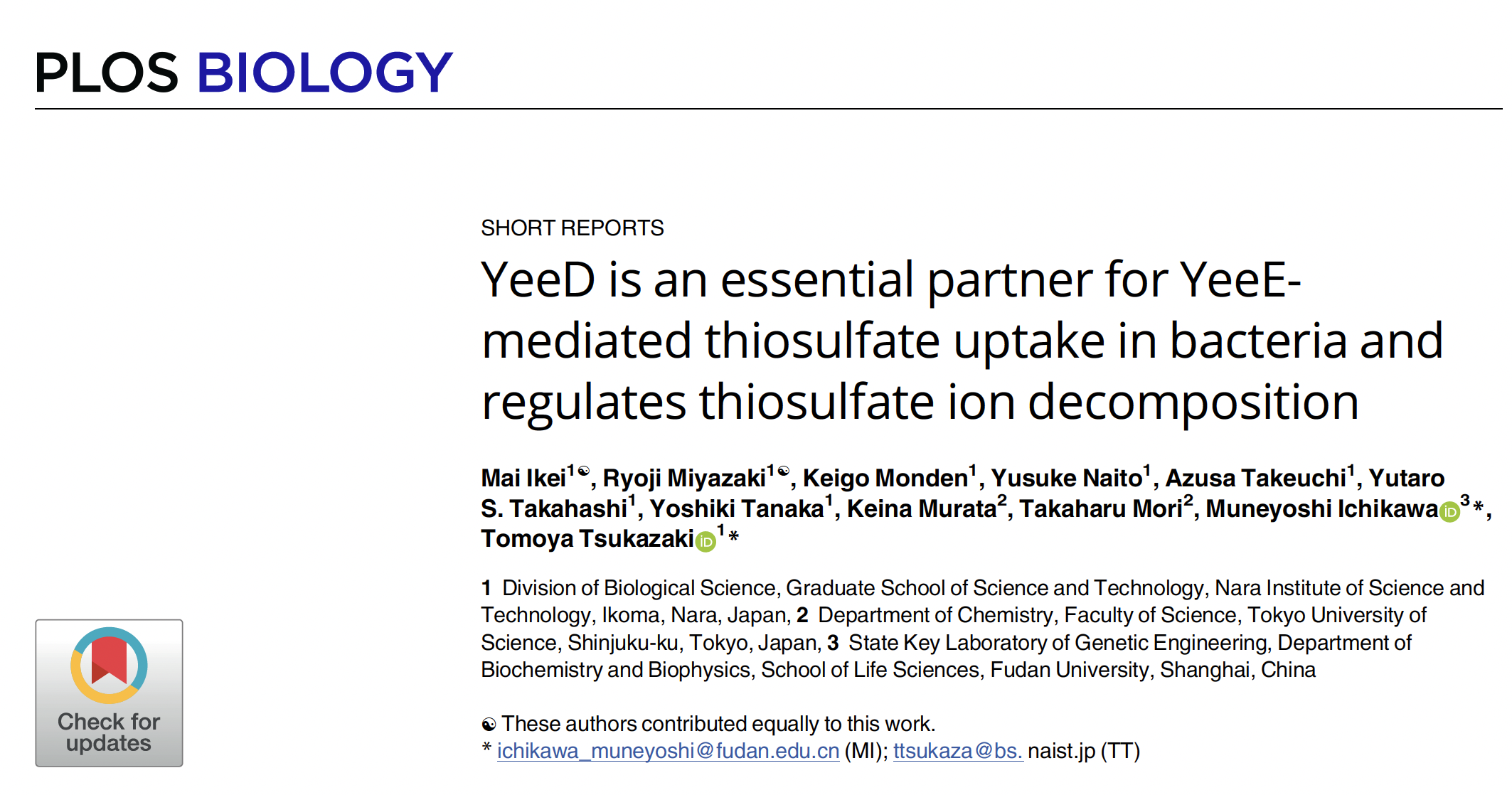 市川宗严(ICHIKAWA Muneyoshi)青年研究员于PLOS Biology杂志在线发表了题为 “YeeD is an essential partner for YeeE-mediated thiosulfate uptake in bacteria and regulates thiosulfate ion decomposition”的研究论文。