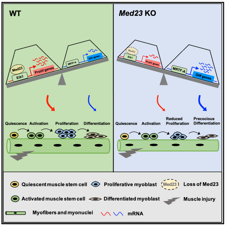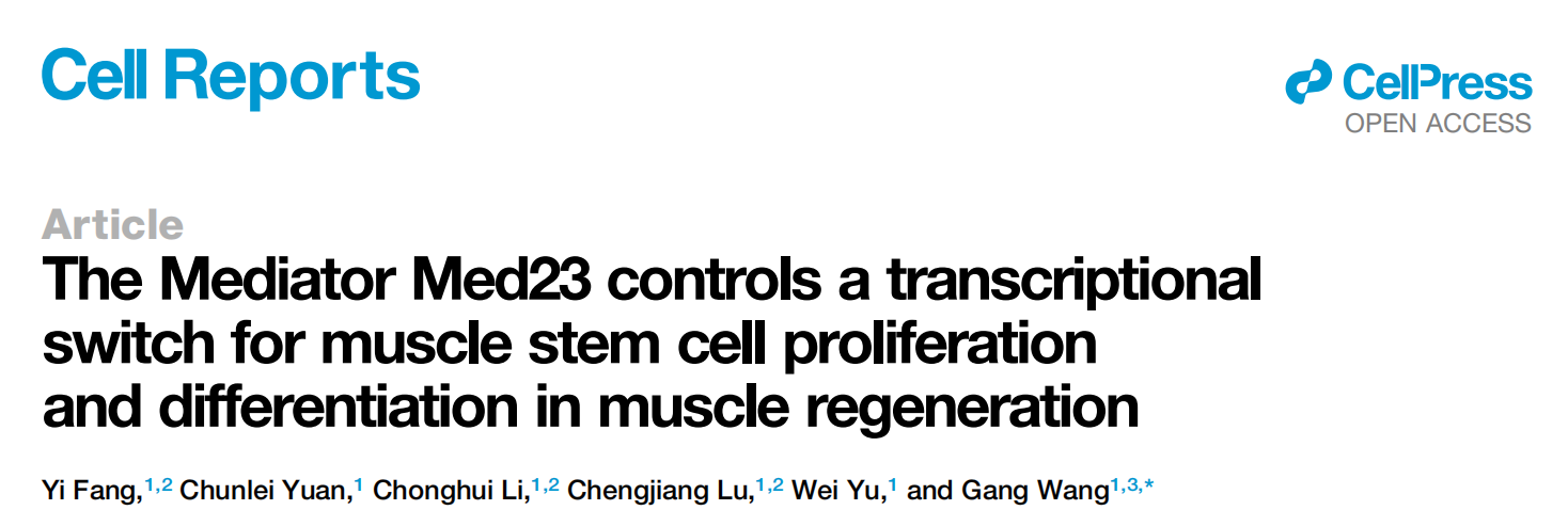 2024年4月30日,复旦大学王纲教授团队在Cell Reports杂志在线发表了题为The Mediator Med23 controls a transcriptional switch for muscle stem cell proliferation and differentiation in muscle regeneration的研究论文。该研究通过小鼠体内外实验,发现Med23亚基缺失会使肌肉干细胞MuSCs增殖减缓并表现出预分化,从而导致肌肉再生能力减弱。