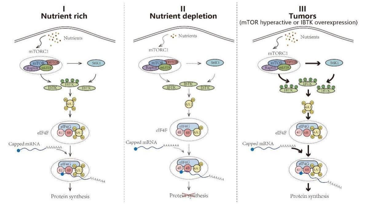 这项工作首次提出了 “mTORC1/S6K1-IBTK-eIF4A1” 信号轴失调在肿瘤发生发展过程中的重要作用,加深了对癌细胞如何劫持翻译机器以促进其生存的理解,并为开发新的癌症治疗方法提供了潜在途径。