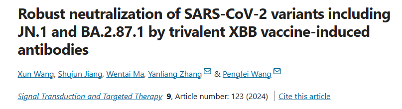 2024年5月9日,贝博体育官网 王鹏飞联合南京市中医院于国际权威杂志Signal Transduction and Targeted Therapy在线发表题为“Robust neutralization of SARS-CoV-2 variants including JN.1 and BA.2.87.1 by trivalent XBB vaccine-induced antibodies”的论文,研究显示威斯克3价XBB疫苗针对多种新冠变异株比XBB突破感染者诱导了更强的中和抗体反应,可有效对抗广泛的新冠病毒变异株。