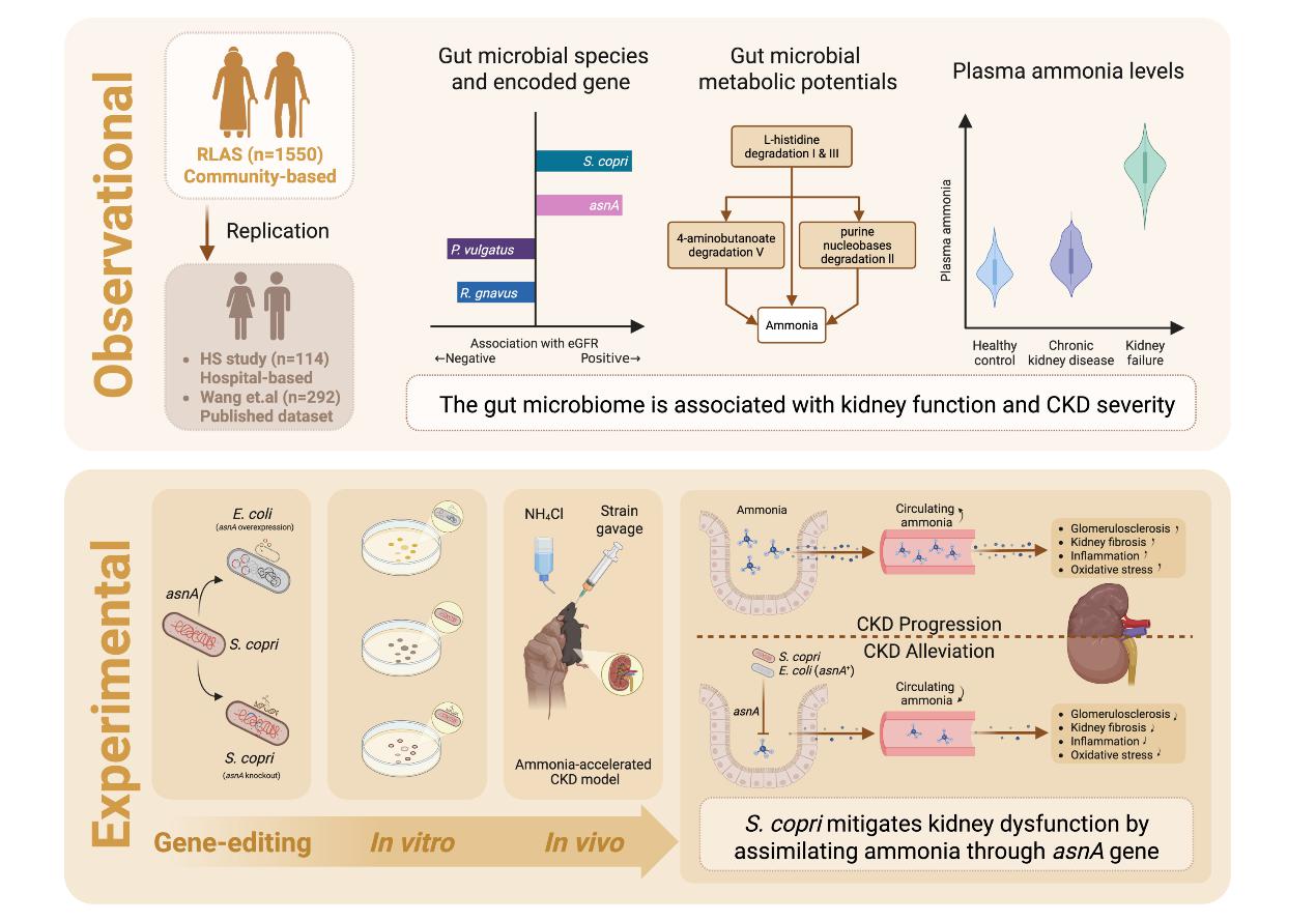 慢性肾病(CKD)是一种因肾功能减退或肾脏受损而无法正常过滤血液的渐进性疾病。CKD影响全球约9.1%的成年人,不仅直接导致每年约120万人死亡,更是心血管等其他慢性疾病的核心风险因素。既往研究表明,肠道菌群稳态与CKD进展相关,然而肠道菌群影响肾功能的潜在机制尚不明确。在这项研究中,研究人员结合人群队列数据分析与机制实验验证,探索了肠道菌群影响CKD的潜在机制。