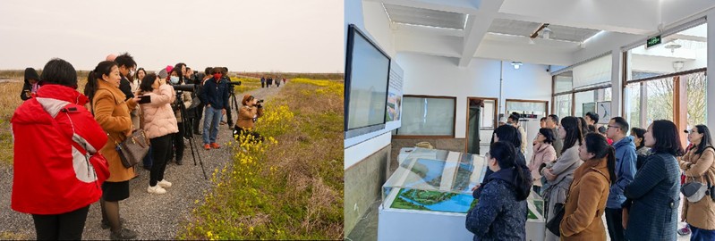 3月19日,参会老师继续前往上海崇明东滩,考察复旦大学长江河口湿地生态系统国家野外科学观测站。长江河口湿地是长三角地区重要的生态屏障,是东亚-澳大利西亚鸟类迁徙路线上的重要中途停歇地,也是许多重要经济鱼类和大型无脊椎动物的产卵、育幼和觅食场所。复旦大学早在1998年就开始布局长江口湿地,关注并研究河口湿地生态系统演替和生态系统服务及其形成机理。经过多年的建设与发展,复旦大学长江口湿地站于2020年入选国家级野外站择优建设名单,台站也称为我院生态学专业学生的实践类课程的重要基地。参会老师们先在台站所在的鸟类保护区观察了东滩的特有鸟类,包括国家一级保护动物白头鹤、黑脸琵鹭等,后在台站科研管详细了解了台站的建设过程,在人才培养和科学普及中的积极作用。
