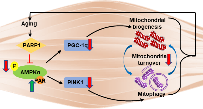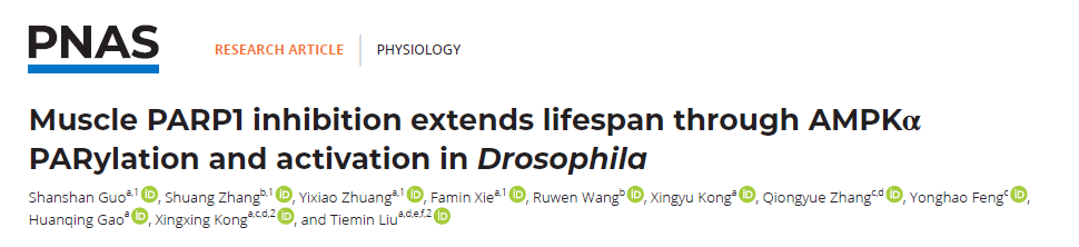 2023年3月23日,复旦大学刘铁民教授团队和孔星星教授团队在PNAS杂志上合作发表了一篇题为Muscle PARP1 inhibition extends lifespan through AMPKα PARylation and activation in Drosophila的论文,该研究指出在年老果蝇中抑制PARP1,可延长寿命,并发现在骨骼肌中敲低PARP1可通过下调AMPK的多糖ADP-核糖基化修饰、增加AMPKα的活性,后者通过上调PGC-1α和PINK1的表达导致线粒体周转加速,肌肉代谢增加、功能增强,阐释PARP1/AMPK参与精准调控衰老进程的分子机制。