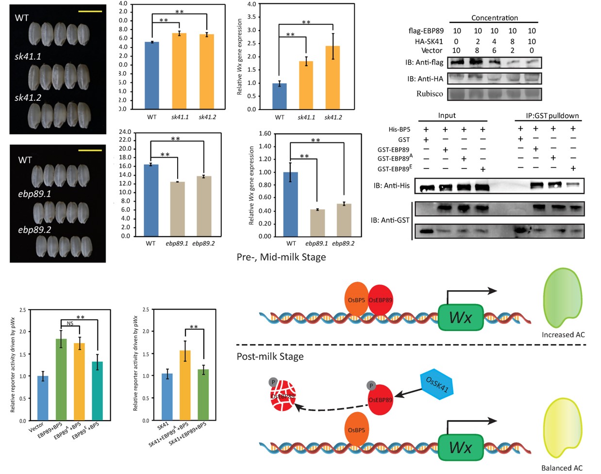 该研究利用酵母双杂交系统筛选到一个AP2/EREBP转录因子OsEBP89与OsSK41互作,并通过荧光素酶互补(Split-LUC)和免疫共沉淀(Co-IP) 进行了验证。OsEBP89是水稻籽粒直链淀粉含量的正调控因子,它与MYC蛋白OsBP5互作,协同调控Wx的表达。本研究发现OsSK41通过磷酸化OsEBP89,减弱OsEBP89O-sBP5互作,抑制OsEBP89的转录激活活性,使Wx基因表达量下降。本研究进一步完善了水稻直链淀粉含量的分子调控机制。