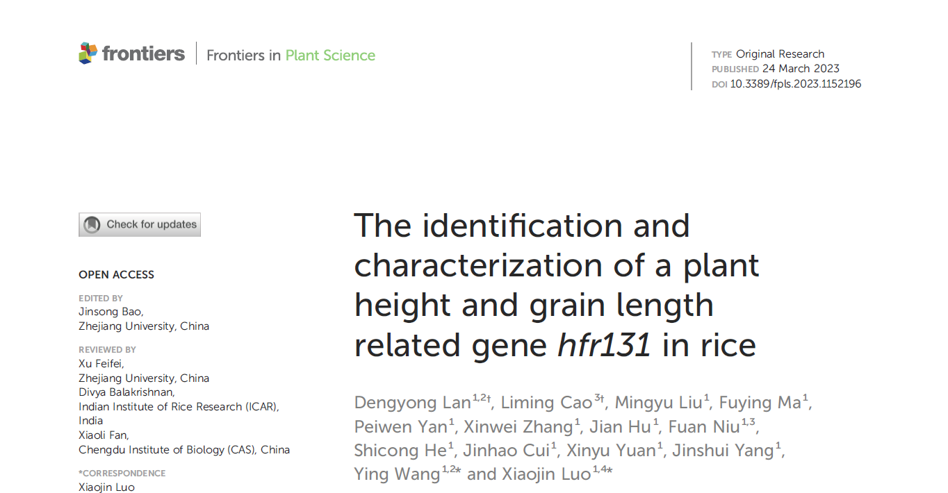 2023年3月24日,复旦大学罗小金课题组在Frontiers in Plant Science在线发表了题为“The identification and characterization of a plant height and grain length related gene hfr131 in rice”的研究论文。该研究采用功能基因组和群体基因组相结合的方法,揭示了BR与生长素协调调控水稻株高和粒型的机制,发现了有利于提高水稻产量的优势单倍型组合。