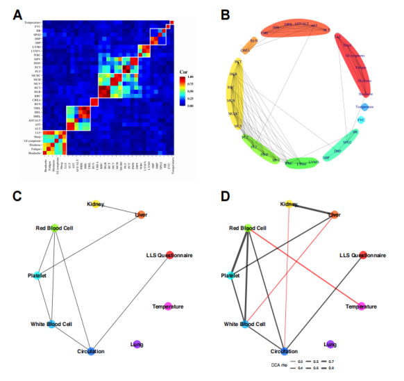 高原习服是探索多个生理系统间协同反应的典型案例,而系统间的协同反应可以通过表型之间的相关分析来量化(图1)。因此项目组结合时间动态性信息,将4个阶段的相同表型整合为纵向单表型,结合典型相关分析和聚类分析算法构建表型网络并挖掘网络模块,提取并定义了9个纵向复合表型,且其中每一个复合表型都能与具体的器官生理系统和功能相吻合;通过纵向复合表型的跨尺度相关网络分析,发现红细胞与体温 (rho = 0.365, p-value = 5.26E-09)、白细胞与肝功能 (rho = 0.287, p-value = 2.43E-05)、肾功能与循环系统模块 (rho = 0.277, p-value = 3.67E-04) 之间存在3个新的协同反应关联信号。其中,肾功能与循环系统可能与高原习服过程中的体液调节相关,为我们理解高原习服过程中的潜在生物学机制提供了新的视角。