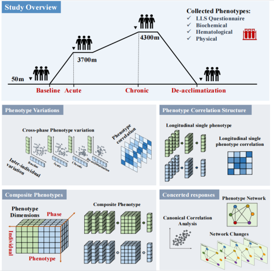图1. 高原习服研究纵向队列设计与复合表型分析方法流程图。