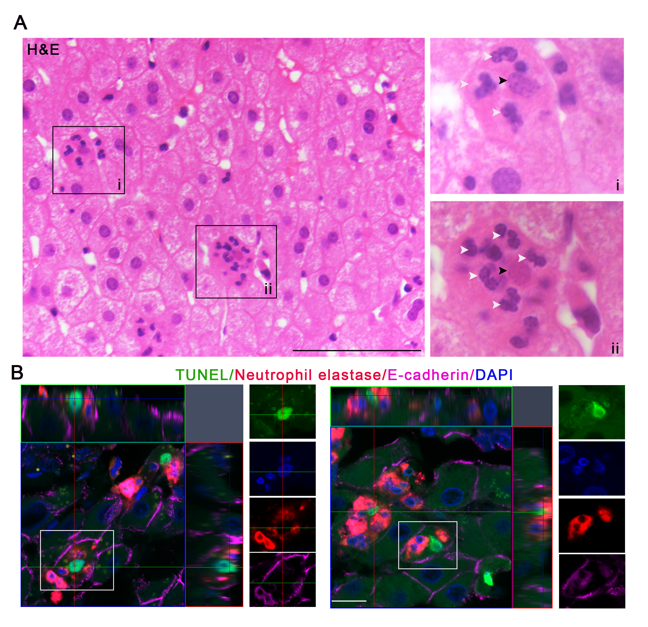 B. TUNEL染色和E-cadherin 和 Neutrophil elastase 抗体染色显示凋亡的肝实质细胞核和钻入的中性粒细胞。