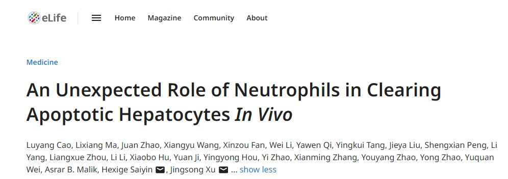 赛音贺西格博士与伊利诺伊州立大学徐劲松博士合作发现人体新的凋亡细胞清理机制-钻入吞噬(Perferocytosis)现象。并以“An Unexpected Role of Neutrophils in Clearing Apoptotic Hepatocytes In Vivo”为题2023年4月5日(清明节)发表在Elife杂志上。