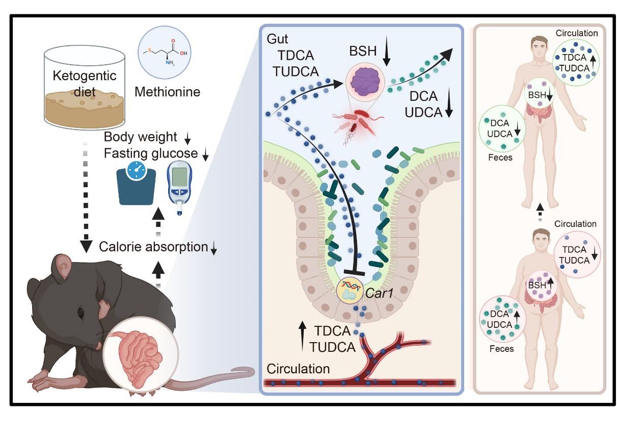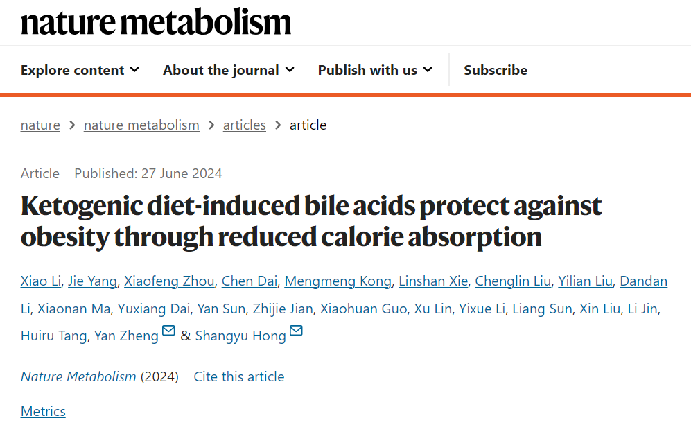2024年6月27日,贝博体育官网 洪尚宇研究团队和郑琰研究团队联合在Nature Metabolism期刊上发表了题为Ketogenic diet-induced bile acids protect against obesity through reduced calorie absorption的研究论文,揭示了生酮饮食通过诱导肠道微生物和特异性胆汁酸变化,减少肠道脂质吸收抵抗肥胖的分子机制。该研究发现肠道微生物依赖性的牛磺脱氧胆酸(TDCA)和牛磺熊去氧胆酸(TUDCA)是生酮饮食发挥抗肥胖作用的关键小分子代谢物,肠道碳酸酐酶1(Car1)是介导肠道脂质吸收的关键靶点。研究成果为肥胖及其并发症的治疗提供了潜在的新靶点和候选药物。