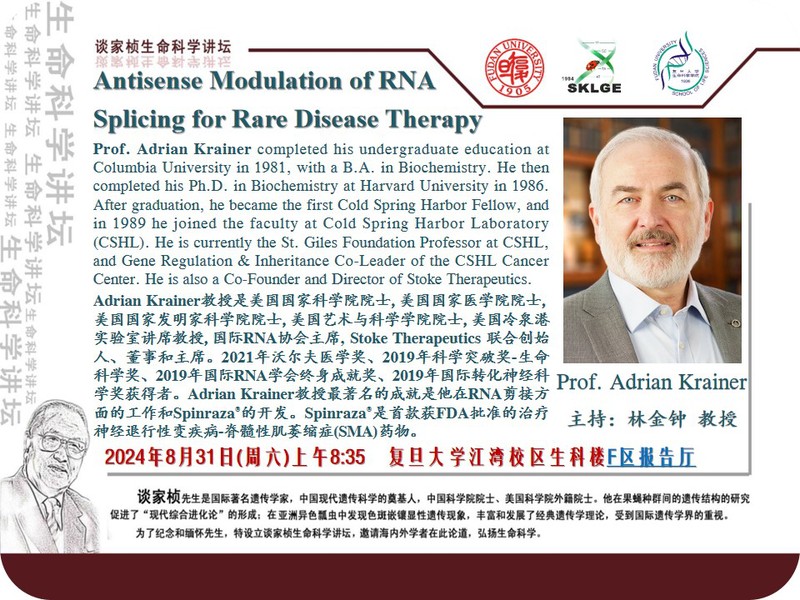 谈家桢生命科学讲坛-8月31日(周六)上午8:35,Adrian Krainer 教授(美国国家科贝博 院士),生科院F报告厅