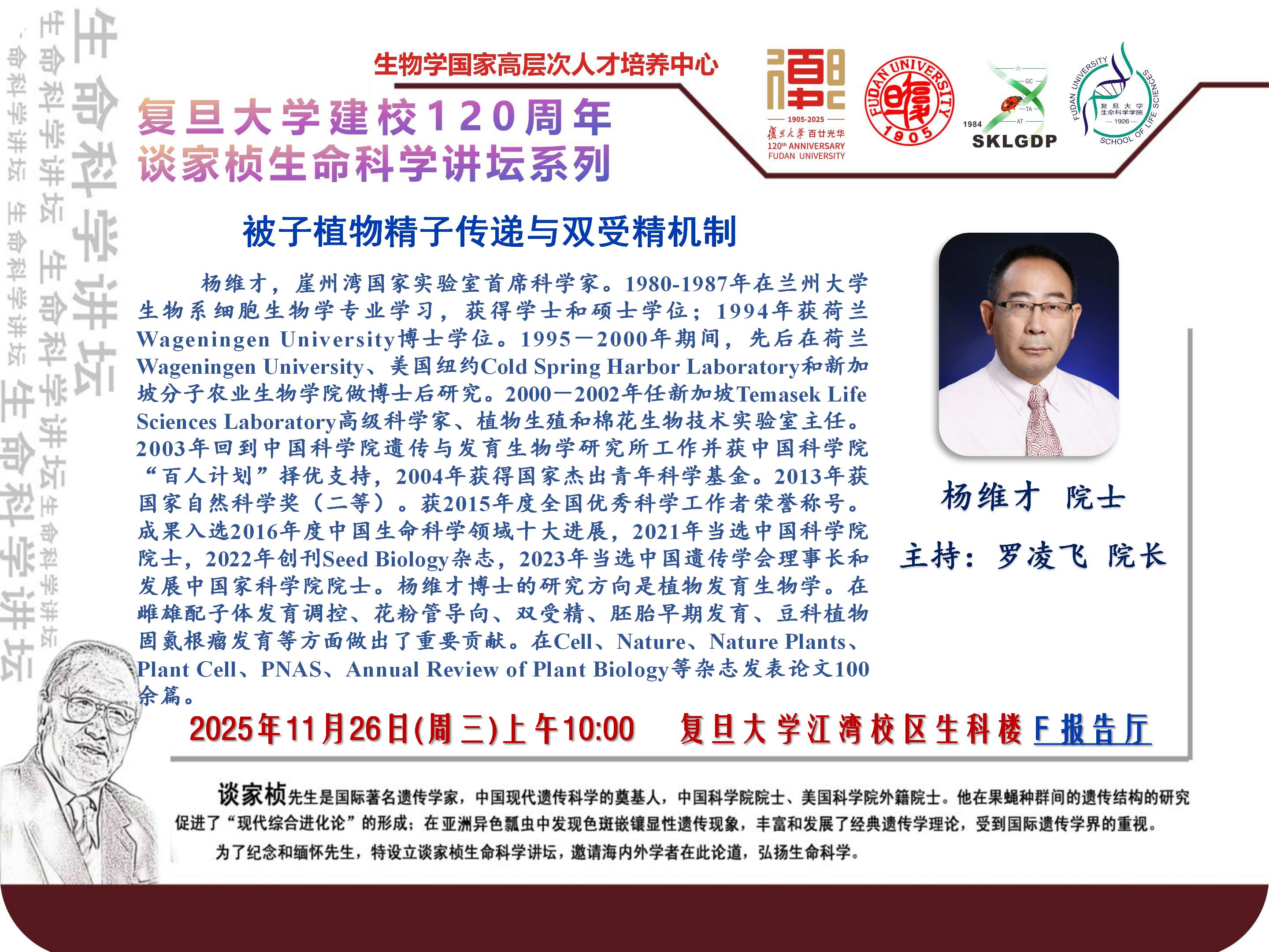 谈家桢生命科学讲坛-2025-11-26(周三)10:00,杨维才 院士(崖州湾国家实验室)