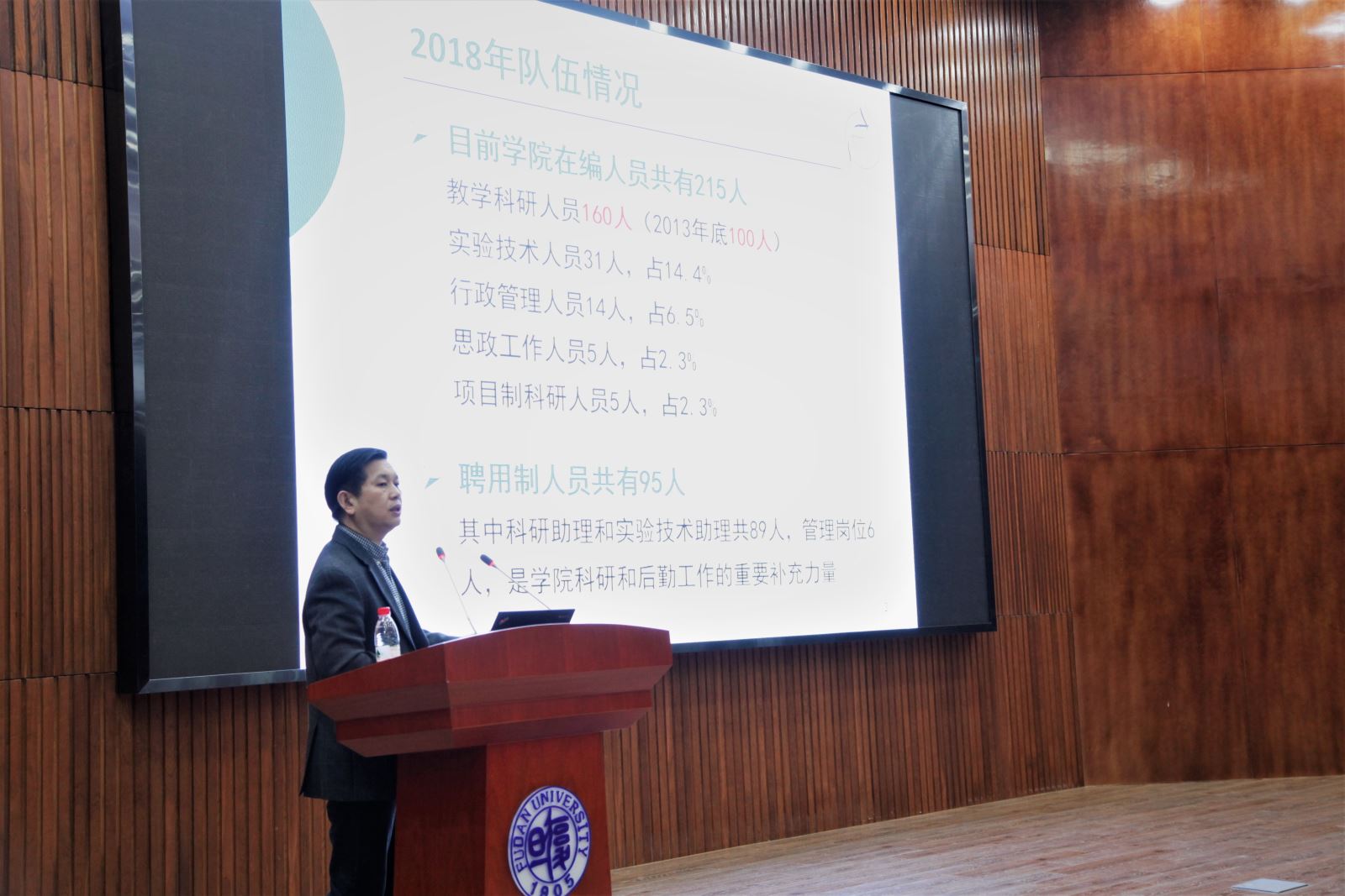 之后,陈浩明书记介绍了学习学校十五次党代会和全国教育大会精神的学习贯彻,组织中心组学习,给全院师生上专题党课,以及布置各支部的学习交流活动等多个维度的活动。其次展开结合中央巡视整改督查的自查工作,完成巡查回头看的整改工作,指出整改永远在路上。再次强调了以学习钟扬老师先进事迹为契机,以师德师风建设为重点加强思想政治教育,推动了复旦大学和西藏大学在生态学科上的合作,成立复旦大学和西藏大学生物多样性与全球变化的联合实验室,同时为钟扬老师的红树林梦想积极落实经费和场地,将相关工作延续。之后介绍了以本科教学迎评为契机,完善人才培养体系,推动教学PI的改革,组织迎评的后勤保障工作,签订人才合作培养基地,进行扎实的迎评动员和准备。最后从人事管理、退管、校友、安全管理等多个方面进行了本年度的工作总结。