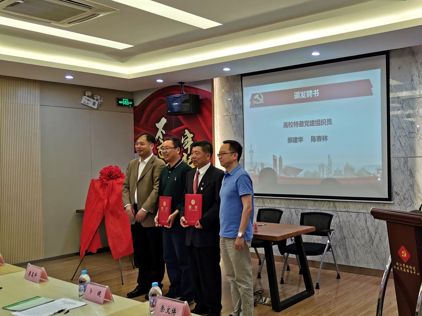 共建的签约、揭牌仪式于下午两点准时开始。仪式上,贝博体育官网 学生党总支书记余文博与新江湾城老年协会离退休干部党支部书记郝建华签订《共建协议》。贝博体育官网 党委书记陈浩明、党委副书记余文博为高校特邀党建组织员郝建华、陈春林颁发聘书。新江湾城街道党工委书记、人大工委主任杜娟与复旦大学江湾校区管委会主任李高平为贝博 “组织生活室”揭牌。杨浦区和新江湾城街道的领导们还为贝博体育官网 学生党支部赠书,鼓励青年人不断学习、追求进步。