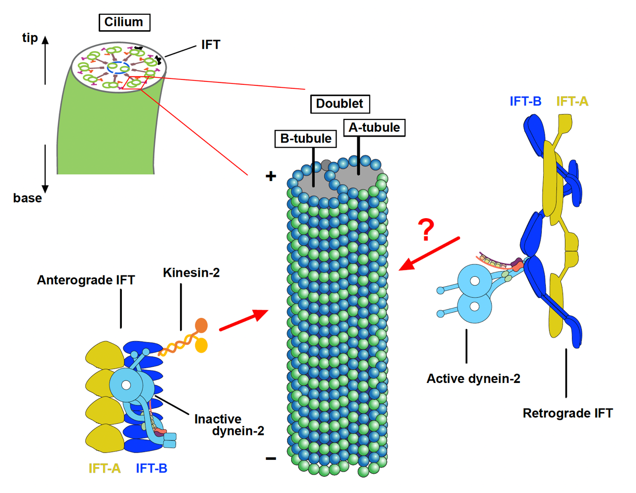 纤毛内运输(Intraflagellar transport, IFT)列车负责二联微管与纤毛膜之间的货物运输过程,对纤毛复杂结构的组装和维持至关重要。在IFT过程中,由kinesin-2驱动的顺向(anterograde)IFT列车将货物和dynein-2从胞质运输至纤毛末端。随后,顺向IFT列车重塑为逆向(retrograde)IFT列车,并由dynein-2将其运回细胞体(图1)。为了避免在二联微管与膜之间的有限空间中发生顺逆向IFT列车碰撞,二联微管作为一条“双轨道”,早期研究显示,顺向IFT列车位于B微管上,而逆向IFT列车位于A微管。然而,逆向IFT列车为何特异性地选择A小管作为逆向运输的轨道,其分子机制至今仍未明了。