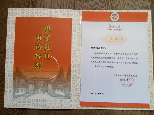 2011年7月1-2日,由复旦大学生命贝博 和8223校友主办的“生物技术前沿国际研讨会”,这次会议是8223校友毕业25年后的第一次大的聚会。在此次会议期间,在感恩母校和母校的老师辛勤栽培的同时,8223校友们踊跃为母校奉献,纷纷解囊相助,供筹集捐赠款陆万伍仟零叁拾贰元人民币,其中叁万元资助复旦大学生物博物馆,叁万伍仟零叁拾贰元资助复旦大学生科院退休基金。
