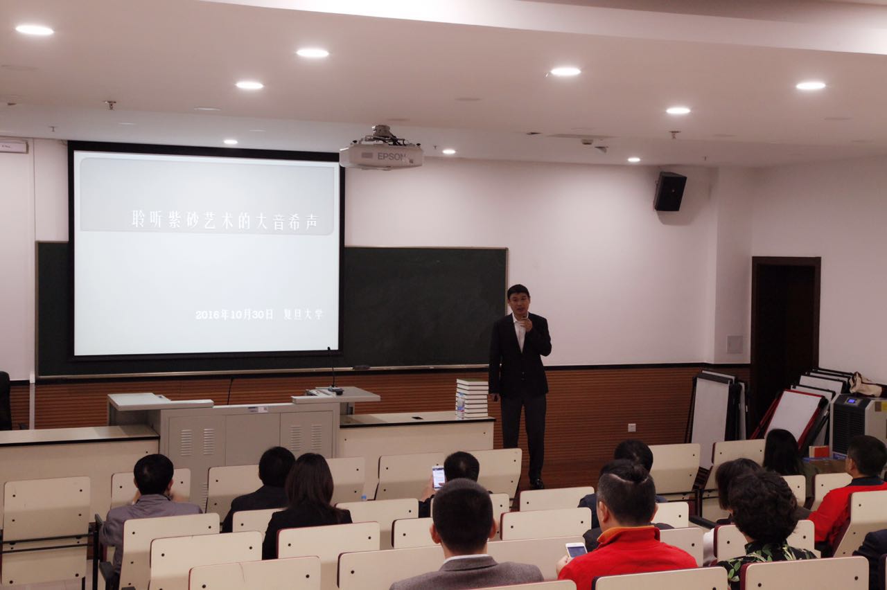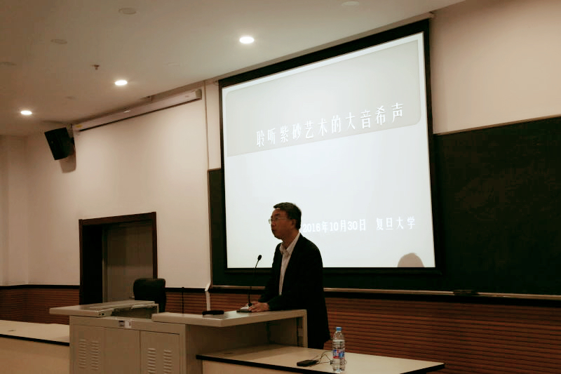 10月30日,在复旦大学邯郸校区立人生物楼107报告厅,紫砂鉴藏研究专家赵岳先生以“聆听紫砂艺术的大音希声”为主题给校友们讲授了一堂别开生面的紫砂壶艺术鉴赏课。此次讲座由江苏省泰州中学上海校友会和复旦大学生科贝博 全球校友会联合主办。