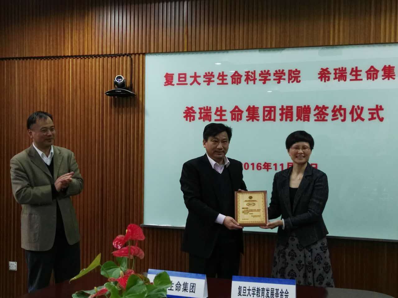 复旦大学对外联络与发展处处长、复旦大学教育发展基金会秘书长潘俊向希瑞生命集团授予捐赠证书。