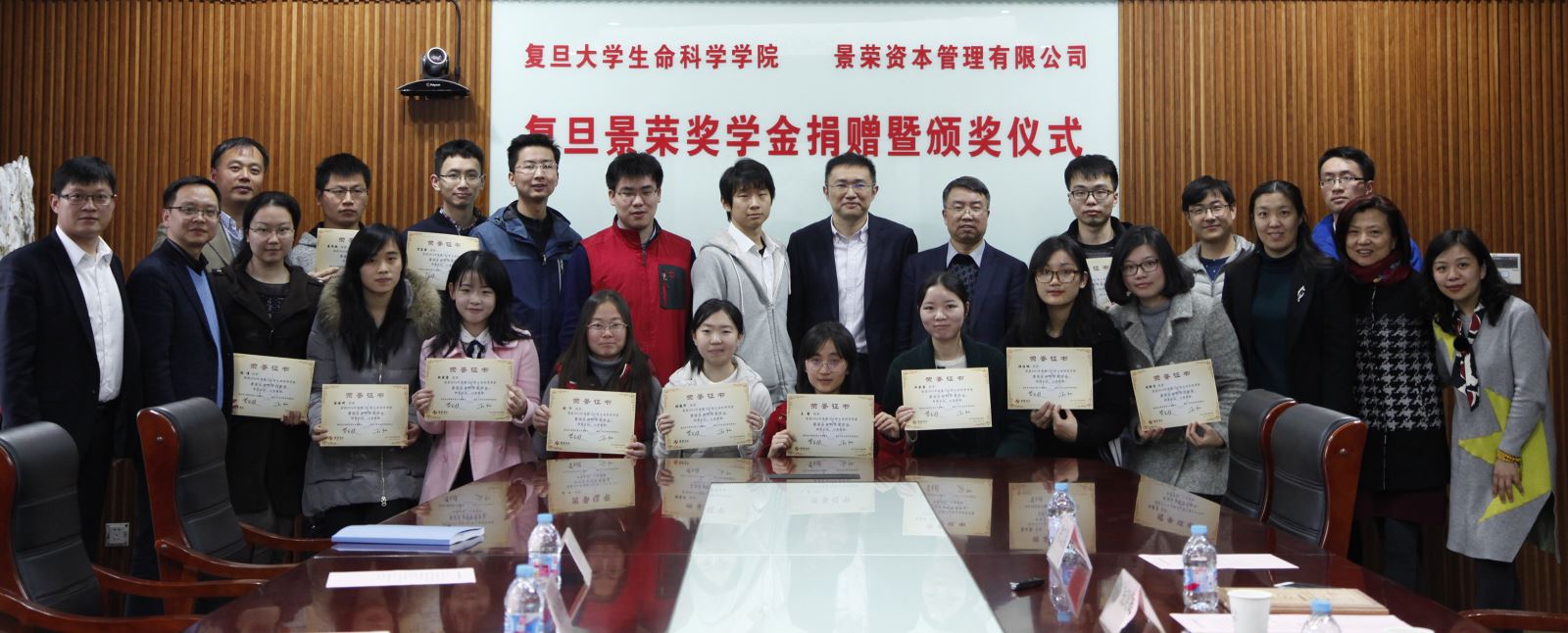 上海景荣 投资控股有限公司副总裁钱庭栀随后宣读2016年度复旦景荣生命科学奖学金获奖学生名单。陆颖丰副处长、陈浩明书记、钱庭栀副总裁、余文博组长分别为“景荣创新奖学金奖”以及“景荣奖学金”的各位获奖学生进行颁奖。颁奖后,与会领导,老师以及同学们一同进行了合影留念。