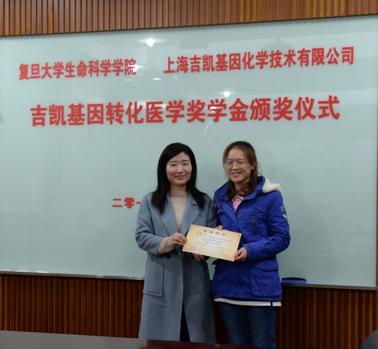 为支持转化医学事业的发展,鼓励优异的复旦学子,满足生命科学行业对人才的需求,吉凯基因与复旦生命科贝博 于2016年共同设立并颁布了此项奖学金。此项奖学金的设立,亦是吉凯基因董事长曹跃琼女士作为复旦校友对母校的真诚回报与贡献。集团副总裁朱向莹博士应邀出席此次颁奖礼。此外,本次颁奖礼还得到了复旦大学校领导的极大关怀,复旦大学对外发展与联络处处长杨增国老师代表学校到场祝贺。