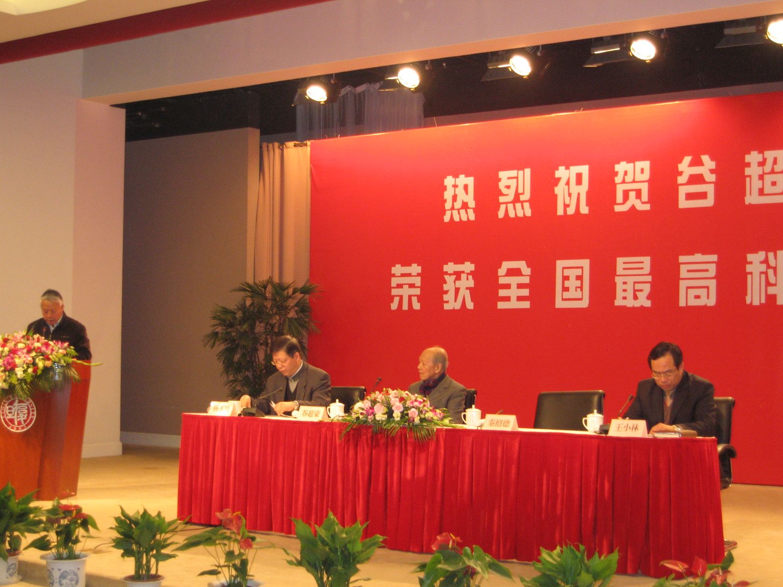 2010年1月18日下午三时,我有幸参加复旦大学党委召开的“热烈祝贺谷超豪教授荣获全国最高科学技术奖”大会。当党委书记、校长陪同谷老进入会场走上 主席台时,雷鸣般的掌声响彻光华大楼。我压抑不住内心的激动和喜悦,拿出随身带的相机按下了快门,留下了这难忘的时刻。