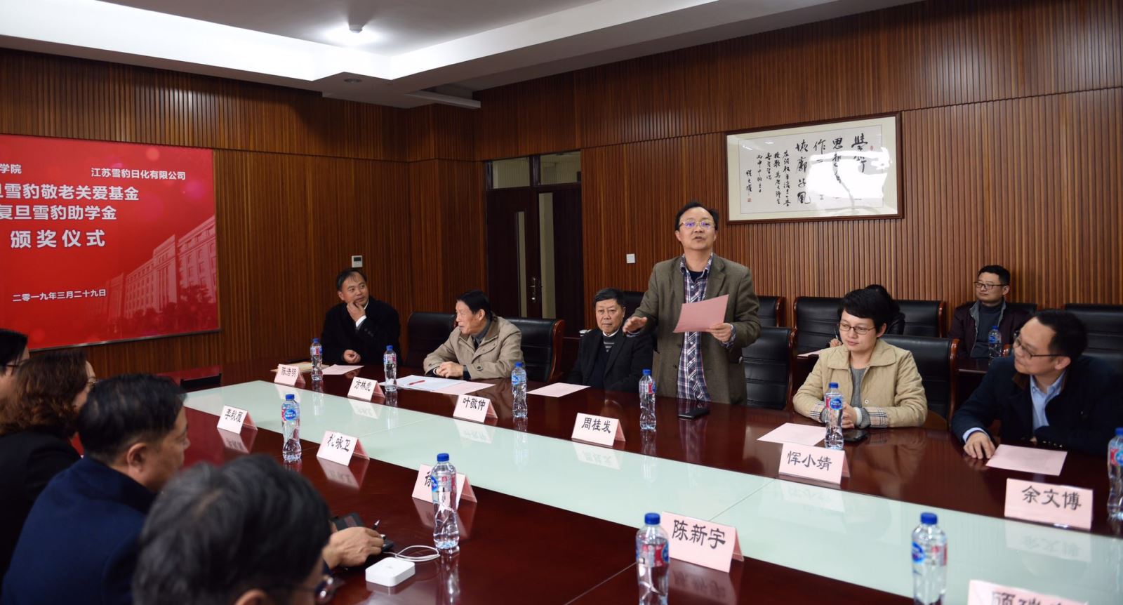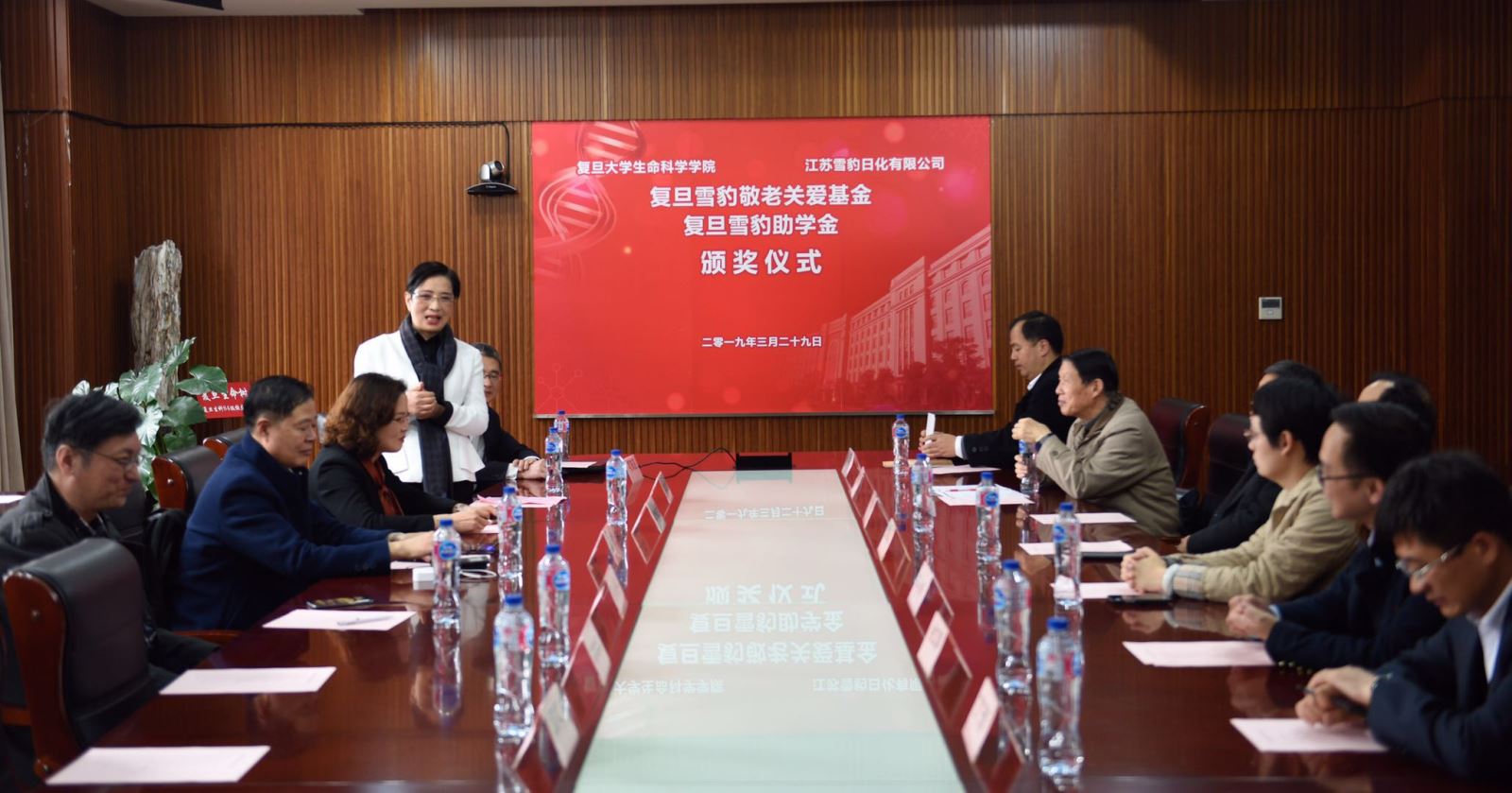 2019年3月29日下午,复旦雪豹敬老关爱基金和雪豹助学基金颁奖仪式在贝博 A208会议室隆重举行,复旦大学老教授协会会长方林虎,复旦大学退管会常务副主任周桂发,复旦大学对外联络与发展处副处长恽小婧,江苏雪豹日化有限公司董事长李秋雁一行,贝博体育官网 分党委书记陈浩明,分党委副书记余文博、丁澦,院退管工作委员会副主任叶敬仲出席颁奖仪式。会议由陈浩明书记主持。