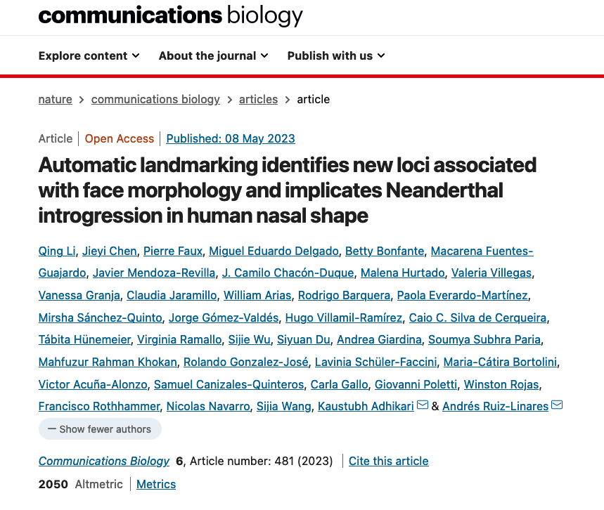 2023年5月8日,复旦大学等机构的研究人员在Communications Biology杂志上发表了题为“Automatic landmarking identifies new loci associated with face morphology and implicates Neanderthal introgression in human nasal shape”的文章。该研究确定了一个能够影响人类鼻子形状的新基因—ATF3,并提出了一个重要猜想:ATF3基因很可能来源于尼安德特人,且这一导致鼻子变高(从上到下)的基因可能是自然选择的产物,因为古代人类在离开非洲后进入了更为寒冷的气候,而鼻梁变高则是它们适应寒冷气候的结果,因为增高的鼻梁结构让他们能够预先加热吸进来的冷空气,避免脆弱的气管和肺部受到冷空气的刺激。