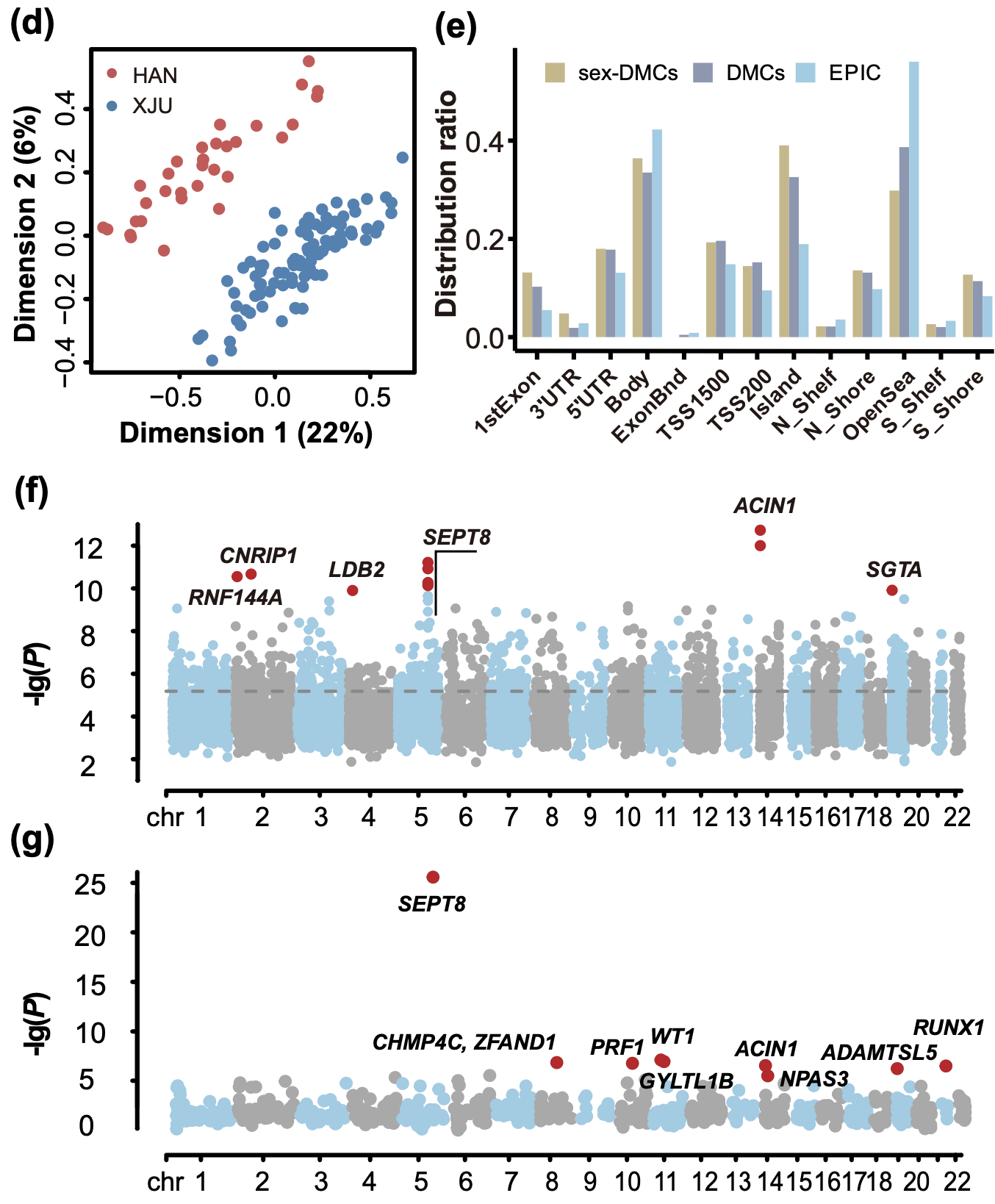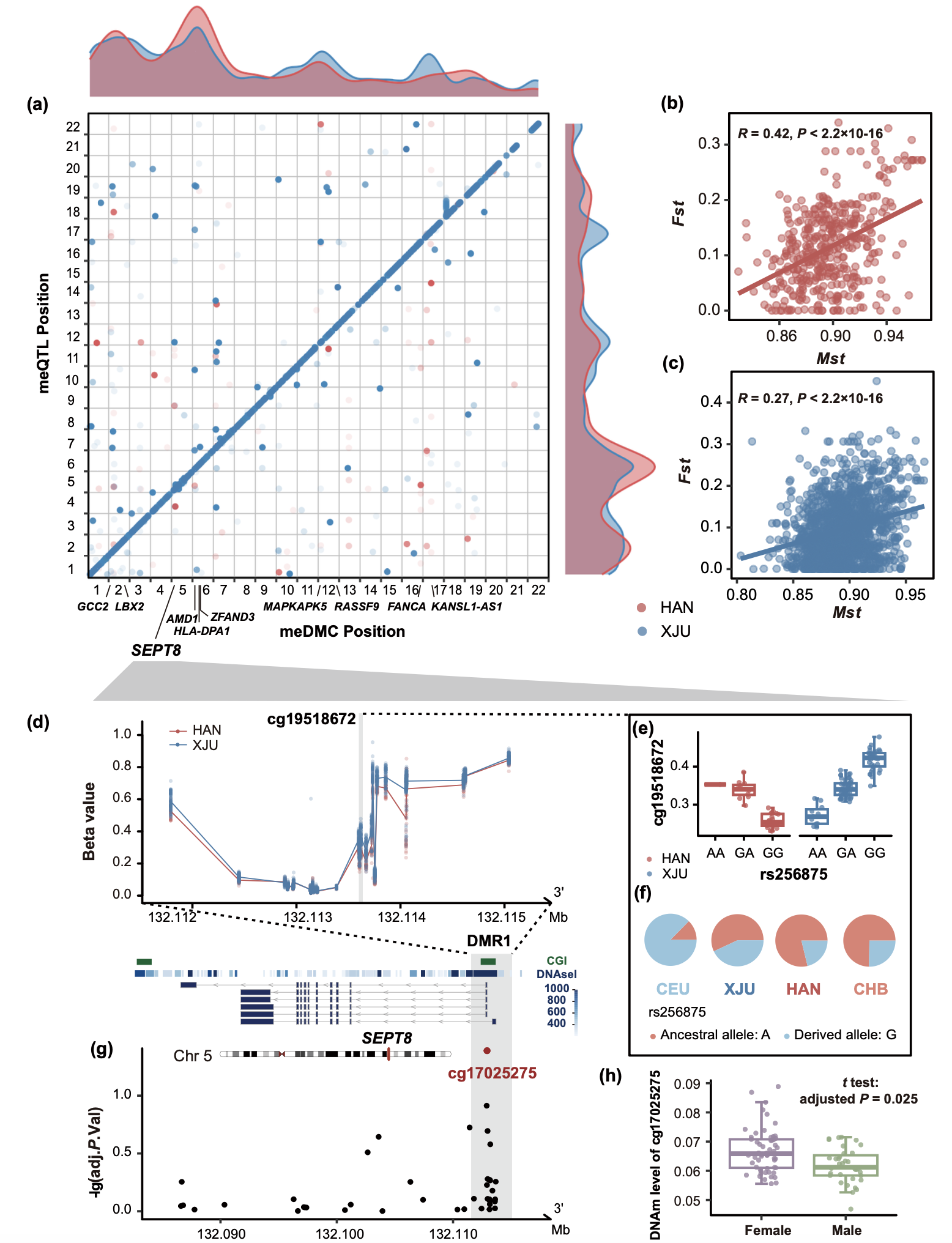 值得注意的事,研究团队发现SEPT8基因的DNAm模式及其潜在遗传调控位点在两族群中的差异最为突出,该基因在神经系统疾病和肾损伤等疾病的发生发展中起重要作用,进一步结合甲基化数量性状(meQTL)分析推测这可能源于遗传融合及后续适应性演化产生的结果和效应。(图4)
