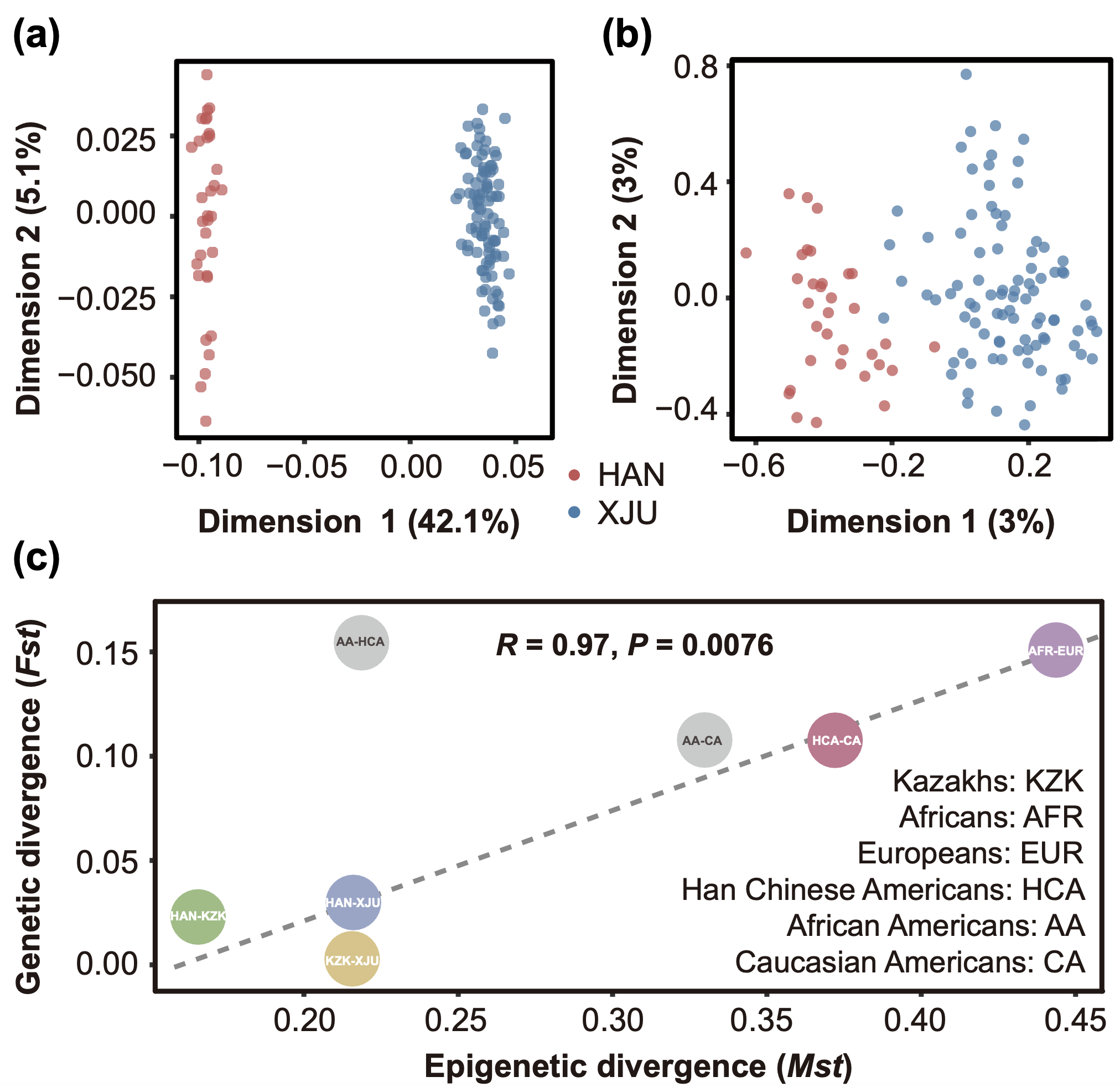 研究团队基于全基因组及DNA甲基化数据分析,构建了汉族和维吾尔族的DNA甲基化图谱;发现族群间DNAm的多样性与遗传多样性及分化程度高度相关,该研究估计遗传变异对DNAm多样性的解释度约为20%。(图2)