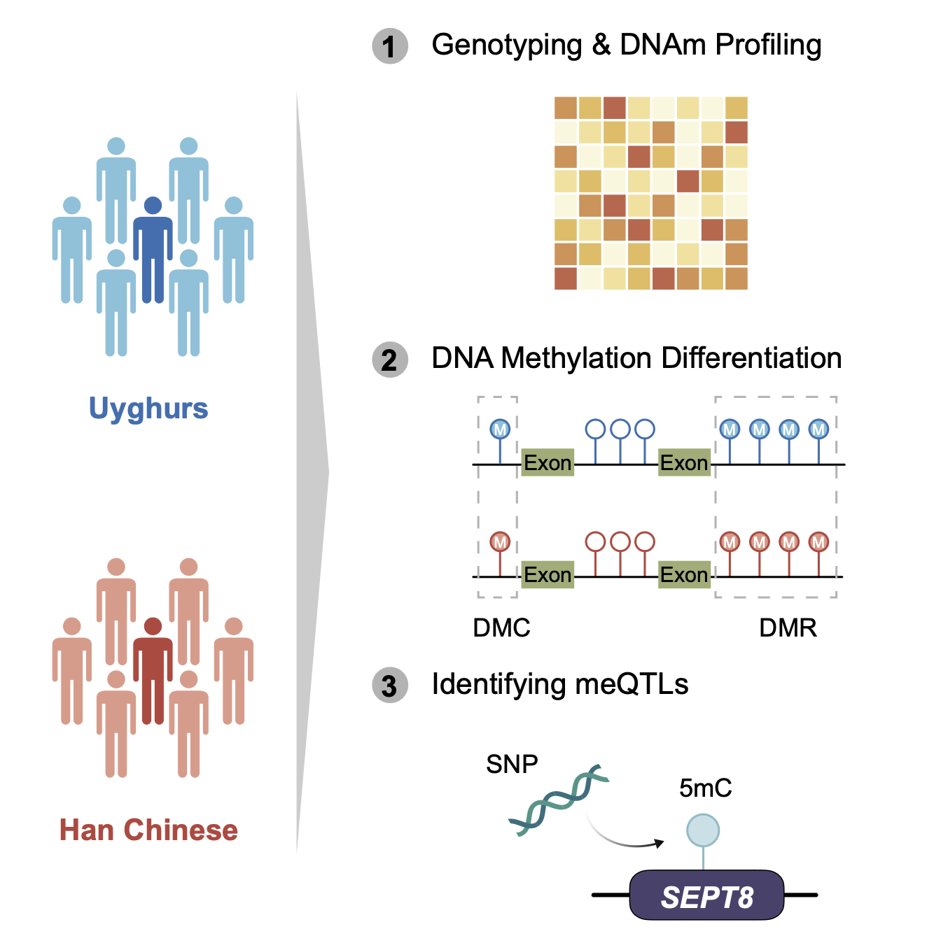 该研究以东西方基因交流的典型代表人群——新疆维吾尔族和东方祖源的典型代表人群——汉族为研究对象,充分借助和发挥维吾尔族人群的遗传融合多样性优势:(1)作为东西方祖源最接近1:1的典型自然混合人群,在群体和个体水平富集东西方人群差异化的遗传变异;(2)相比于西方研究较多的自然混合人群——非裔美国人,维吾尔族遗传融合历史更悠久,在个体和基因水平分布更均匀的东西方来源的DNA片段;(3)同一个体和同一基因较大概率同时携带东西方来源DNA片段,便于解析不同的遗传变异对DNA甲基化或表型的影响。此前,研究团队已经从祖源构成、基因组多样性和遗传融合后的适应性,以及族群表达图谱和性别偏向性表达图谱等多方面对维吾尔族及其祖源代表人群进行了系统解析。该研究中,研究团队则从维吾尔族和汉族的基因型和DNAm图谱、DNA甲基化族群差异以及甲基化数量性状(meQTL)等各方面进行了分析。(图1)