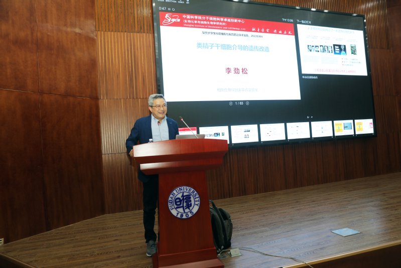 李院士此次报告的主题为“类精子干细胞介导的遗传改造”。2003年人类基因组计划草图的完成,不仅揭示了一本30亿碱基序列的遗传信息天书(其中包括2.2万个编码蛋白质的基因),也标志着后基因组时代的启始。为了全面认知蛋白质,从而在根本上阐释生命,科学家们需要构建基因编辑的动物模型。为了解决胚胎干细胞介导的基因编辑技术复杂、成本高、周期长,以及精子介导转基因效率低、随机整合等缺点,李院士率领团队结合胚胎干细胞高效、精准编辑和精子快速、低成本的优势,建立了小鼠雌雄单倍体胚胎干细胞(即类精子干细胞),证明其能代替精子使卵子受精产生健康小鼠(即“半克隆技术”),并利用类精子干细胞携带CRISPR-Cas9文库实现了小鼠个体水平的遗传筛选。在基因组层面进行了多方面应用,例如复杂疾病的快速模拟以理解和治疗疾病;小鼠发育中靶向遗传筛选;作为研究印记基因的有效工具等。由于蛋白质功能研究很大程度取决于抗体,为了解决抗体带来的问题,实现蛋白质在体研究的简单、高效和标准化,李院士团队于2017年提出并推动基于类精子干细胞技术的基因组标签计划(Genome Tagging Project,GTP),打造生命科学研究的北斗导航系统。GTP计划已在蛋白质伙伴组研究和精准蛋白质图谱的描绘中得到了诸多应用。利用类精子干细胞,李院士率领其团队也开始聚焦于染色体的结构与功能研究,建立了染色体的结构改变细胞系,以探讨染色体结构和数目改变对细胞命运改变的影响。