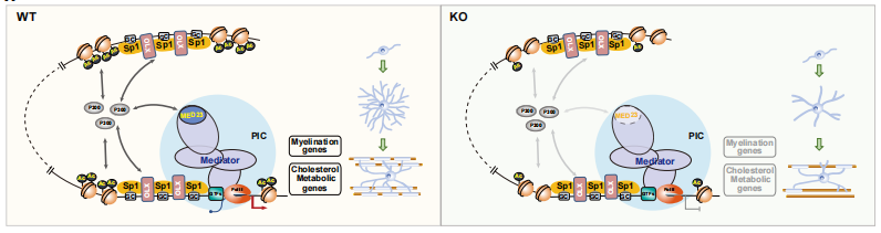 研究团队利用基因编辑技术构建了Med23基因突变小鼠模型,发现Med23基因突变会导致脑白质萎缩、认知功能减退等髓鞘发育不良的典型症状。进一步研究发现,MED23在OLs的分化成熟过程中扮演关键角色,其突变或缺失均会导致少突胶质细胞前体无法分化为成熟的OLs,从而影响髓鞘的形成和再生。为了深入研究MED23亚基调控的分子机制,研究团队结合转录组测序及体外实验,鉴定了MED23可能调控的转录因子Sp1。进一步利用CUT&Tag以及生化实验,研究团队发现在少突细胞分化过程中, Sp1与组蛋白乙酰转移酶P300在全基因组上存在广泛共定位,包括多个OLs分化基因和脂类代谢基因的超级增强子(super enhancer)区域,二者共同激活OLs分化相关基因的表达。MED23亚基作为关键辅因子,其缺失显著降低 P300在Sp1下游靶基因上的结合,从而导致下游多个OLs分化和脂类代谢相关基因的下调,最终抑制OLs的分化成熟。本研究不仅揭示了MED23基因点突变导致人类髓鞘发育缺陷和智力障碍的致病机制,还为髓鞘异常相关疾病的治疗提供了新的思路。