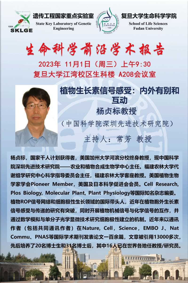 生命科学前沿学术报告-2023-11-01(周三)9:30,杨贞标 教授(中国科贝博 深圳先进技术研究院)