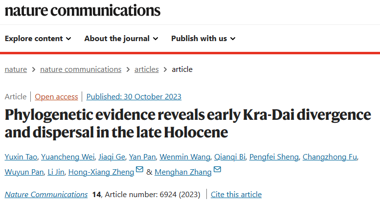 郑鸿翔课题组等多家单位的合作研究成果被《自然-通讯》(Nature Communications)杂志收录并在线发表,成果名称为“Phylogenetic evidence reveals early Kra-Dai divergence and dispersal in the late Holocene”。该研究聚焦侗台语及使用该语言的人群演化历史,联合了广西民族大学文贝博