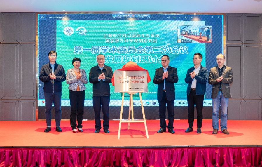 随后,张人禾副校长、鲍达明副司长、汤臣栋副局长、雷小途副局长、施志琴主任、邹丽东副总裁共同为长江口湿地国家站揭牌。