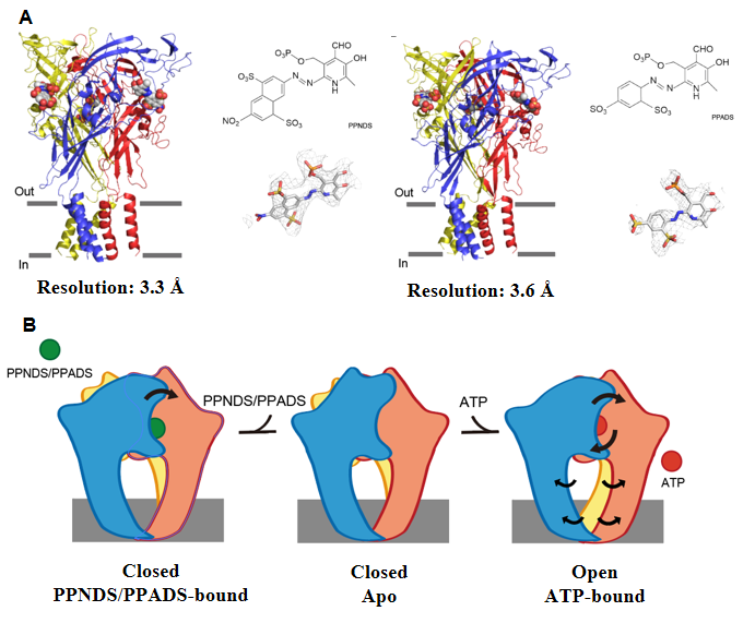 图 (A)P2X7与PPNDS/PPADS复合物结构 (B)P2X7受体正构抑制机制