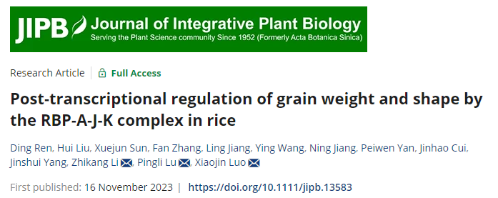 2023年11月16日,复旦大学罗小金/陆平利团队联合中国农科院黎志康团队在JIntegr Plant Biol期刊上发表了题为“Post-transcriptional regulation of grain weight and shape by the RBP-A-J-K complex in rice (Oryza sativa L.)”的研究论文。该研究采用图位克隆、功能基因组、转录组以及群体基因组的研究方法,发现 RBP-A、RBP-J和 RBP-K编码的蛋白质形成了一个 RBP-A-J-K 复合物,对水稻产量相关性状起负调控作用。