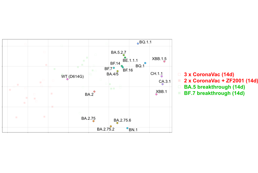 对于疫苗接种后的Delta突破感染的血清,也观察到了与加强疫苗接种组类似的结果,Omicron变异株如BN.1、CH.1.1、XBB.1、XBB.1.5、BQ.1和BQ.1.1显示出很强的血清中和逃逸能力。而对于疫苗接种后BA.2突破感染的个体,其对Omicron变异株的中和滴度降低程度低于疫苗接种组和Delta突破感染组。研究人员进一步评估了BA.5或BF.7突破性感染的个体血清样本对这些毒株的中和能力。结果发现,BA.5/BF.7突破血清对BA.5或BF.7变异株的中和滴度较高,均在1000以上;虽然BQ.1.1、CH.1.1和XBB.1.5等新毒株表现出较强的逃逸能力,但是BA.5/BF.7突破血清对它们中和滴度仍能有200-300,显示出一定的中和能力,提示我们基于新出现的变体开发新型疫苗或许可以更好地控制即将出现的病毒变异株。但是,这些BA.5/BF.7突破血清均是感染后一个月内的样本,其时抗体水平较高,从之前的研究,我们也知道抗体水平会随着时间推移逐渐减低,这些接种疫苗后被BA.5或BF.7突破感染的个体血清对奥密克戎BQ.1.1、CH.1.1和XBB.1.5中和能力能维持多久还需更多的长程研究。