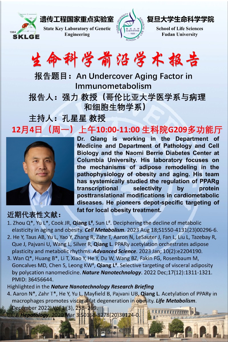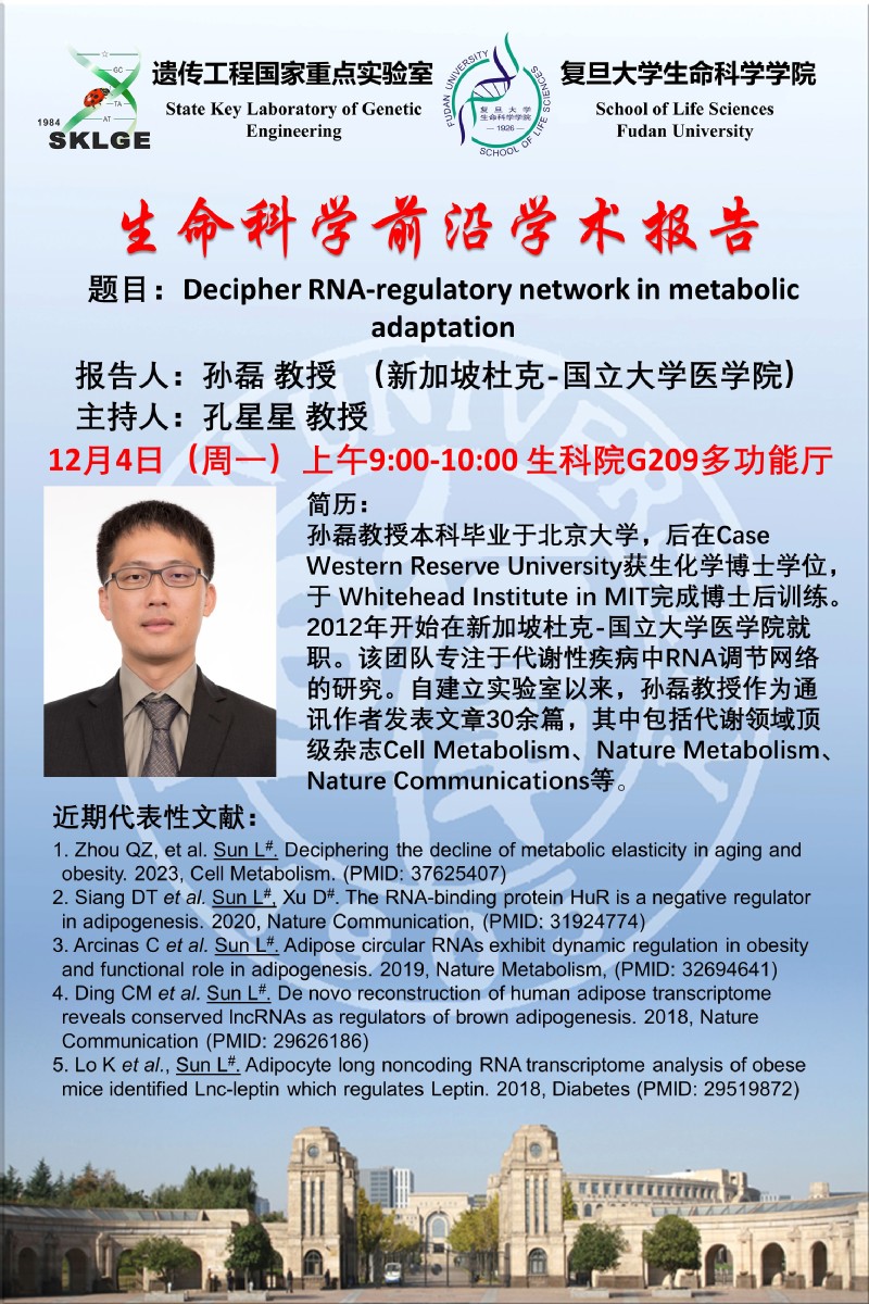 生命科学前沿学术报告-2023-12-4(周一)上午9:00,孙磊 教授 (新加坡国立大学) ,强力 教授(哥伦比亚大学)